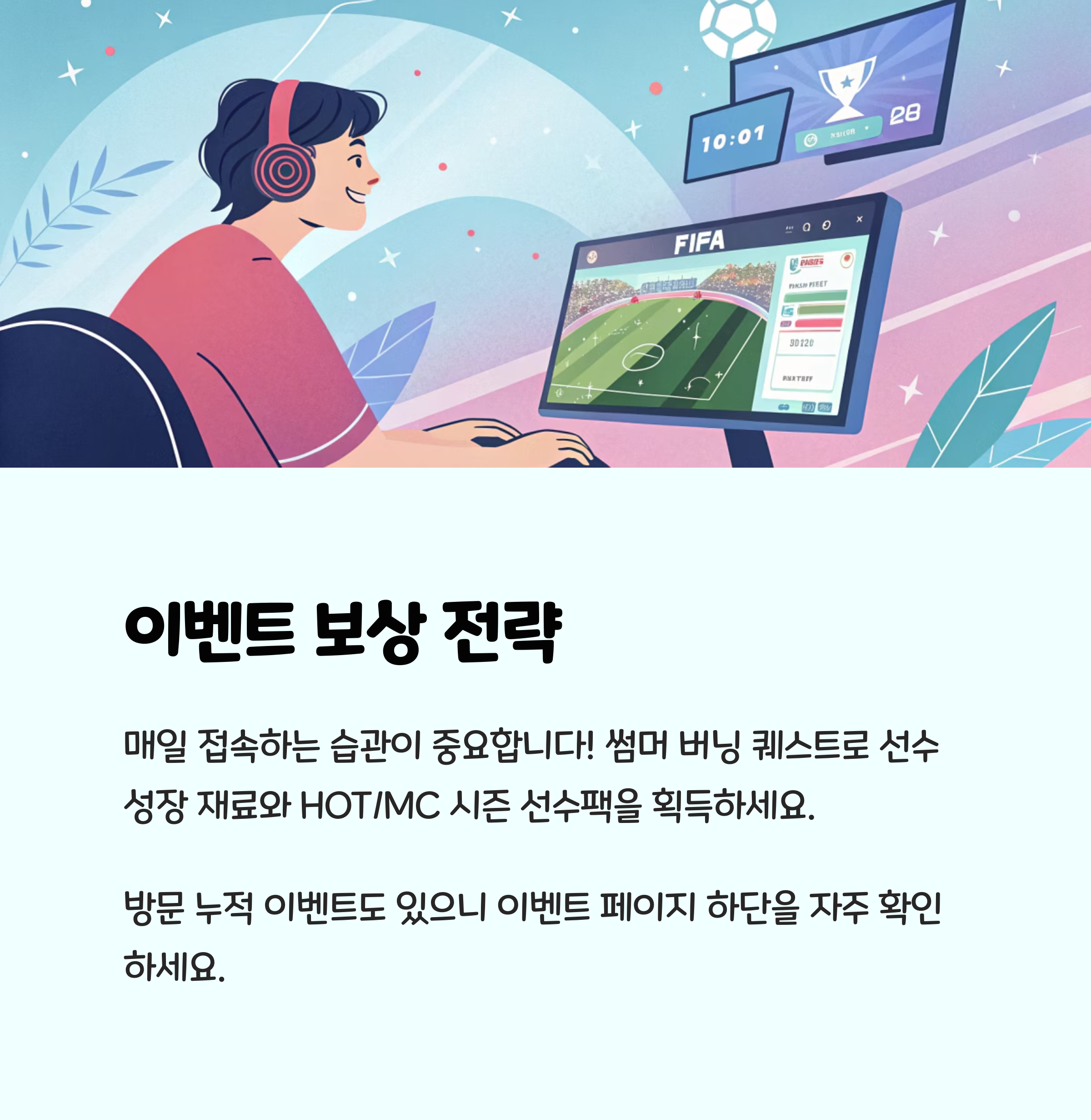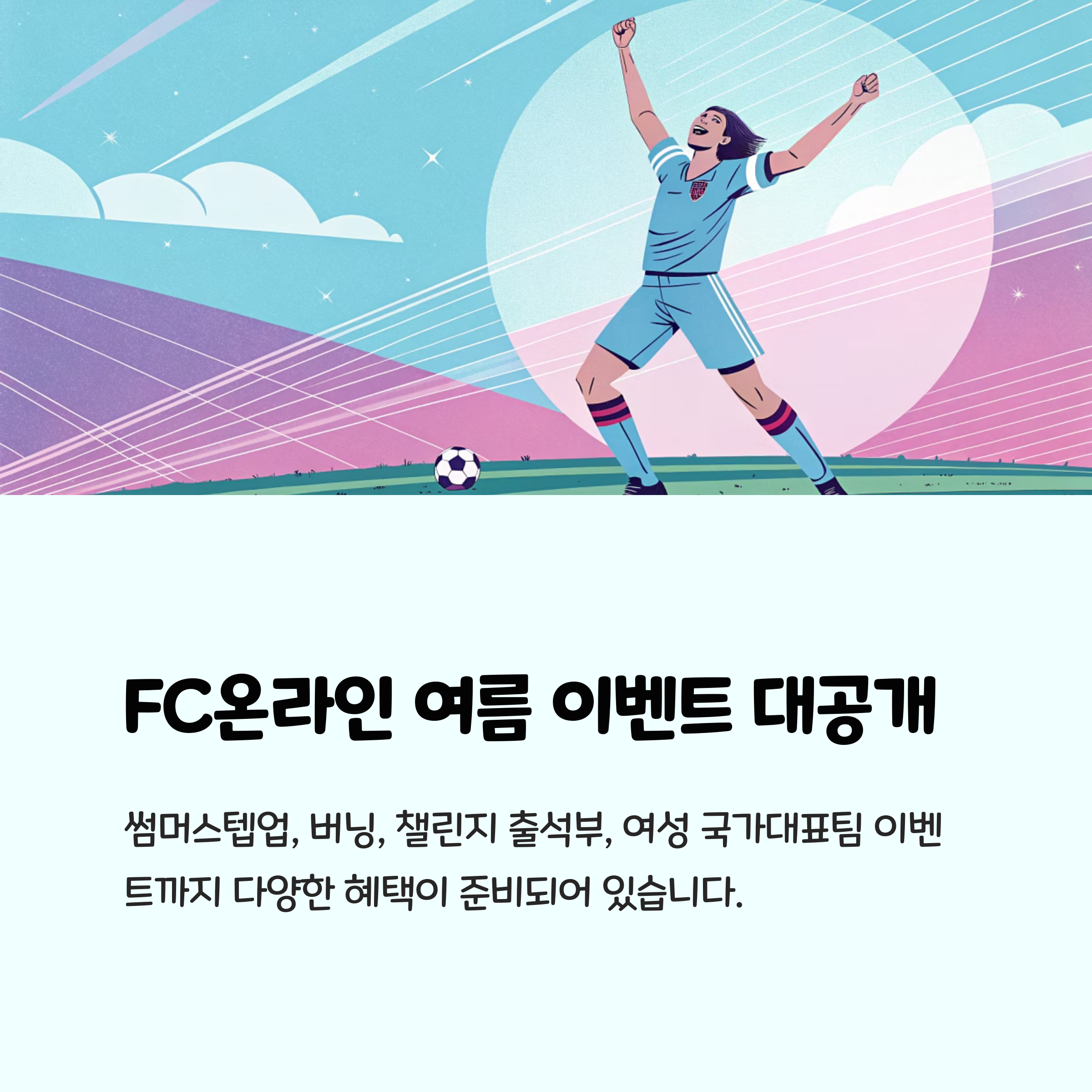 2025년 여름, 피파온라인4 유저라면 절대 놓쳐선 안 될 다양한 여름 이벤트가 진행되고 있습니다. 썸머스텝업부터 버닝, 챌린지 출석부, 여성 국가대표팀 이벤트까지 그야말로 혜택의 향연이 펼쳐지고 있는데요. TOTS 시즌 출시와 함께 강화된 콘텐츠와 다양한 보상으로 팀 전력을 확실히 강화할 수 있는 절호의 기회입니다. 이 글에서는 FC온라인 여름 이벤트의 모든 핵심 포인트를 한눈에 알아보실 수 있도록 정리해 드리겠습니다. 지금부터 꼼꼼히 확인해보세요