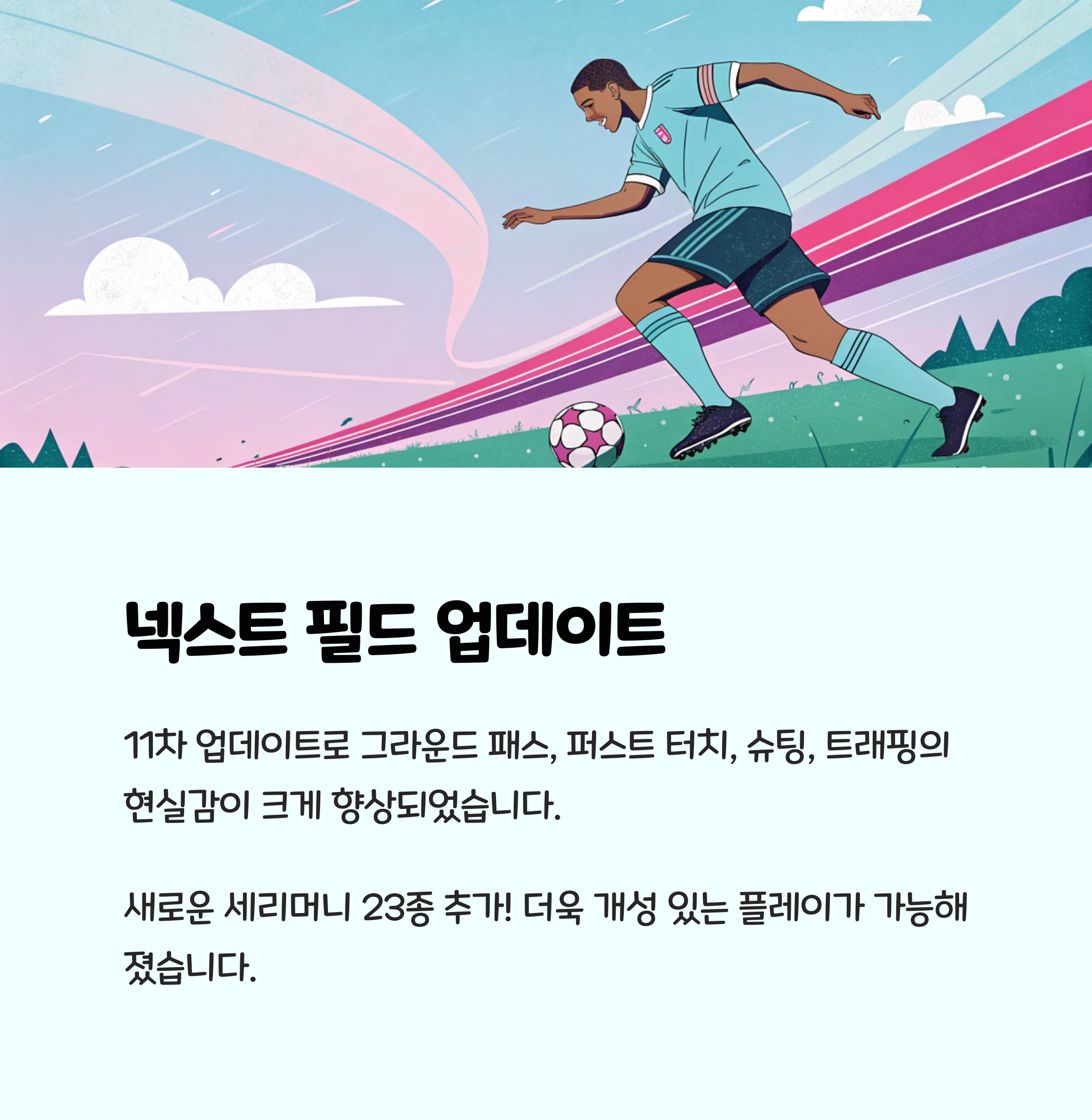 | 플레이 시스템 | 슈팅·패스 정밀도 향상, AI 전술 최적화 |