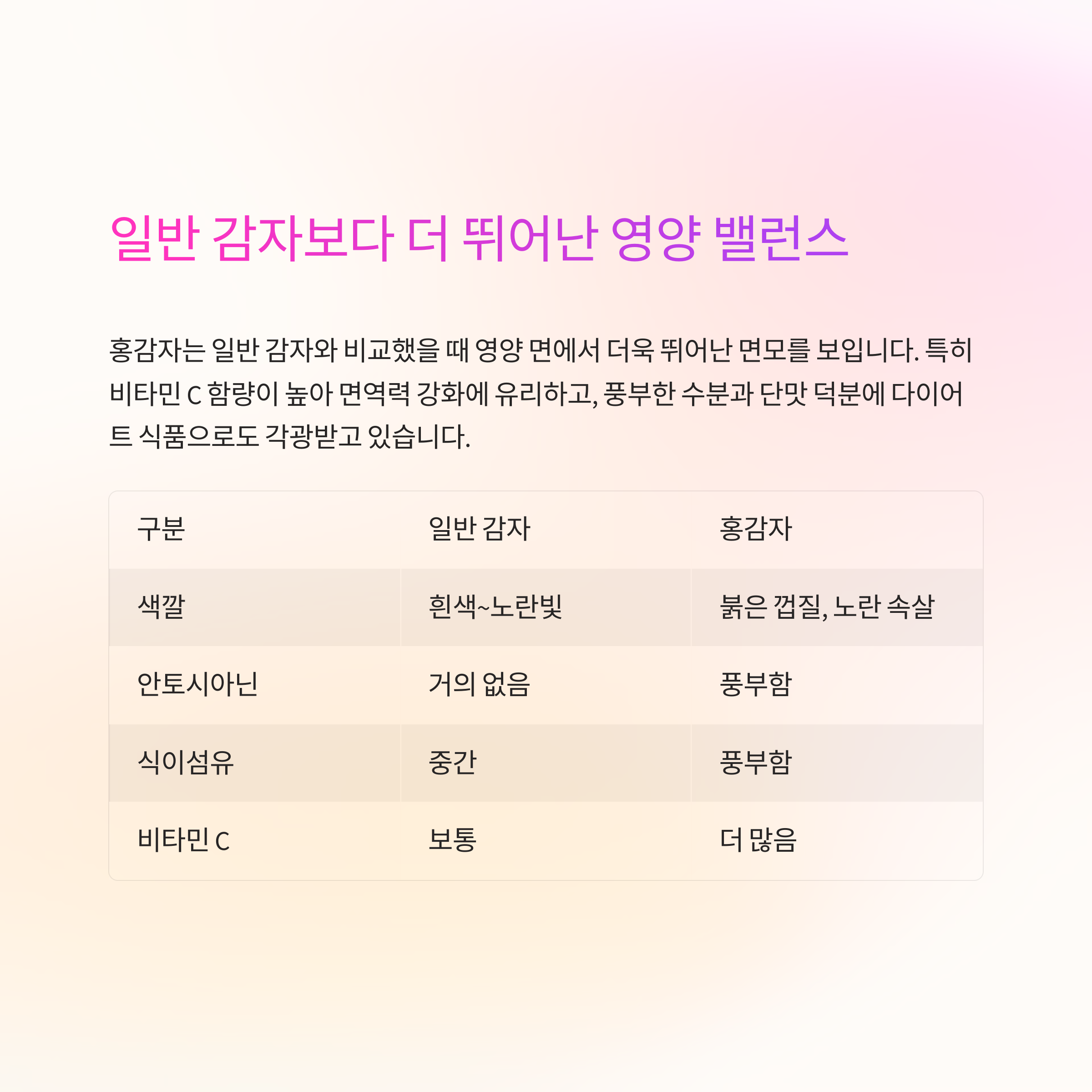 홍감자는 일반 감자와 비교했을 때 영양 면에서 더욱 뛰어난 면모를 보입니다.