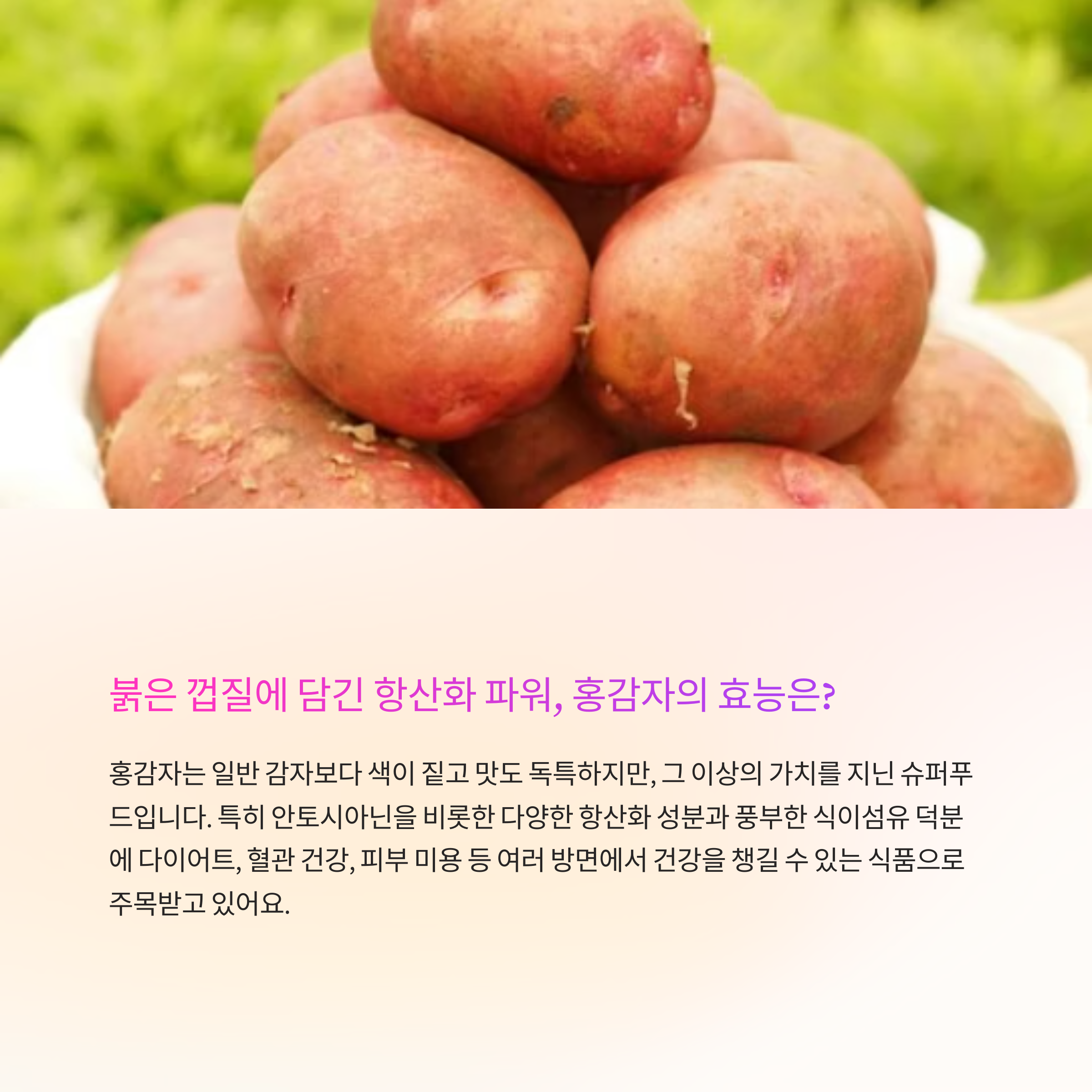 홍감자는 일반 감자보다 색이 짙고 맛도 독특하지만, 그 이상의 가치를 지닌 슈퍼푸드입니다. 특히 안토시아닌을 비롯한 다양한 항산화 성분과 풍부한 식이섬유 덕분에 다이어트, 혈관 건강, 피부 미용 등 여러 방면에서 건강을 챙길 수 있는 식품으로 주목받고 있는데요. 지금부터 홍감자의 효능부터 섭취 시 주의사항, 보관법과 레시피까지 총정리해드릴게요.