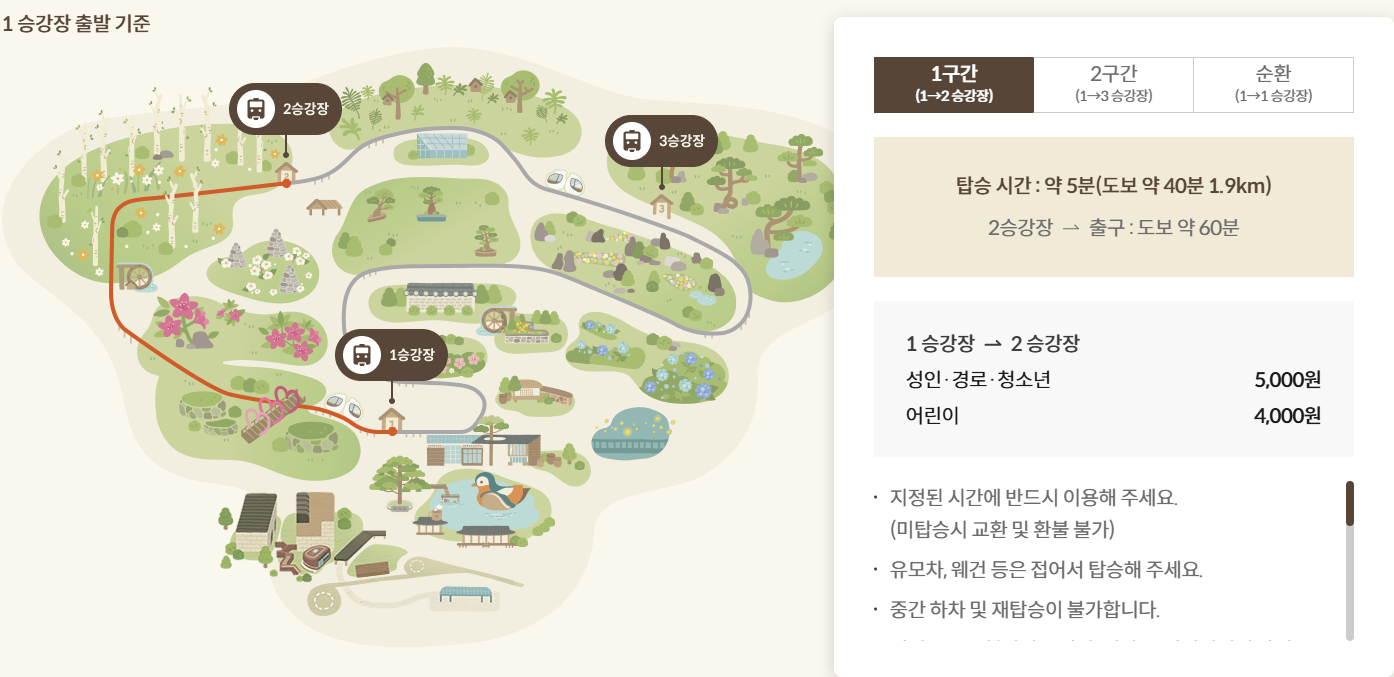 - 운행 코스: 입구 → 중간 정류장 → 정상 → 다시 입구