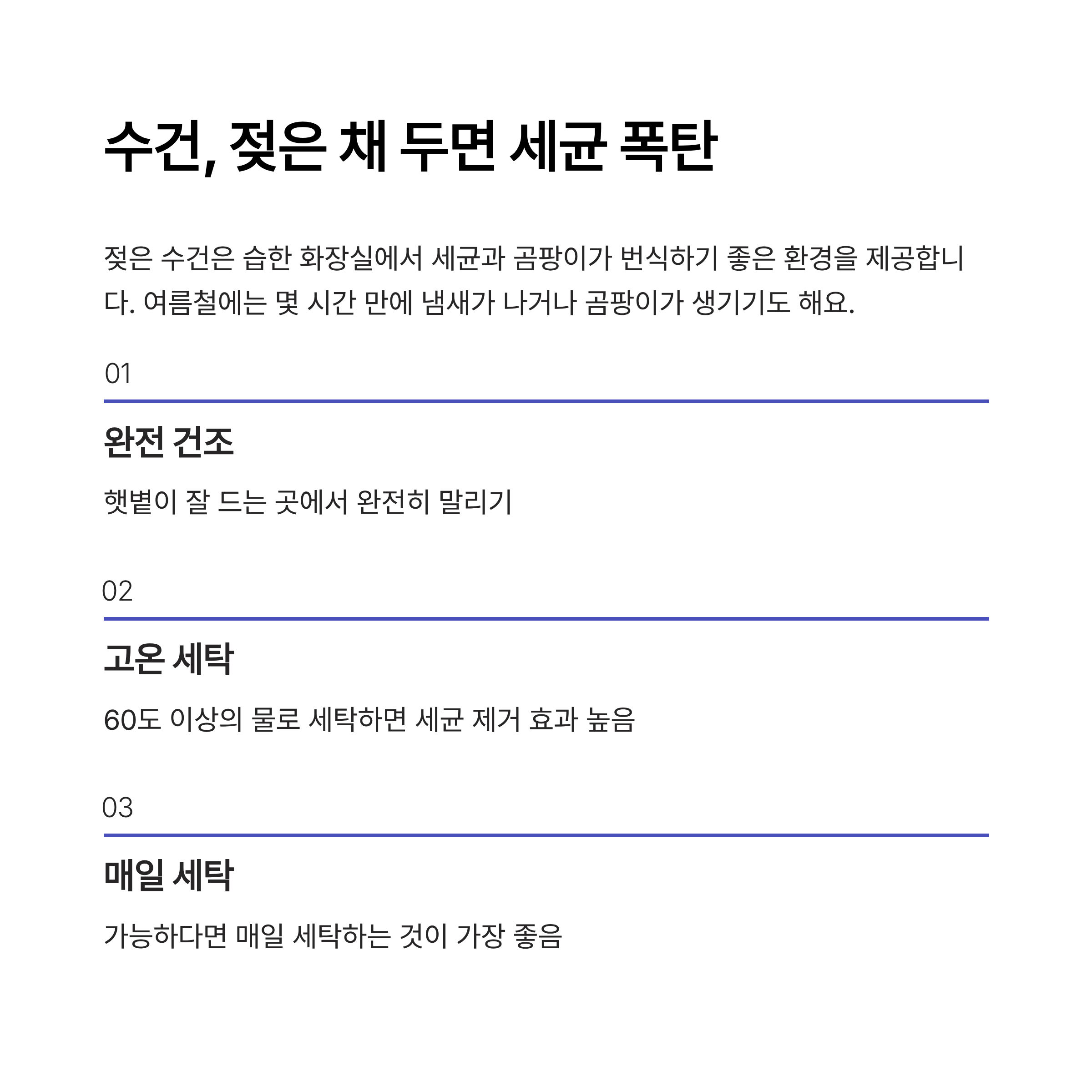 | 수건 세탁 | 매일 또는 2일마다 | 완전 건조 후 보관 |
