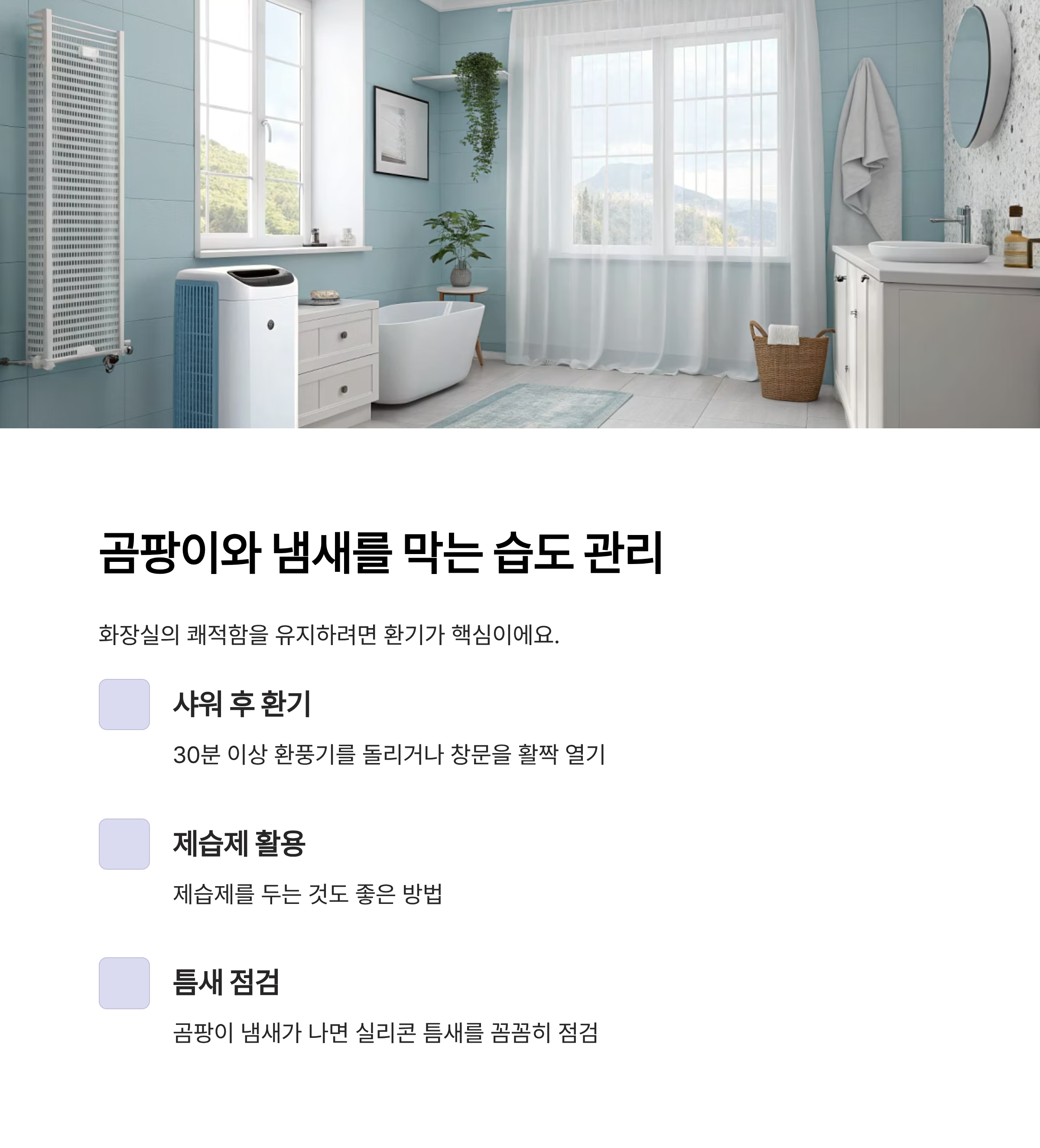 | 환기 | 매일 | 샤워 후 최소 30분 이상 |