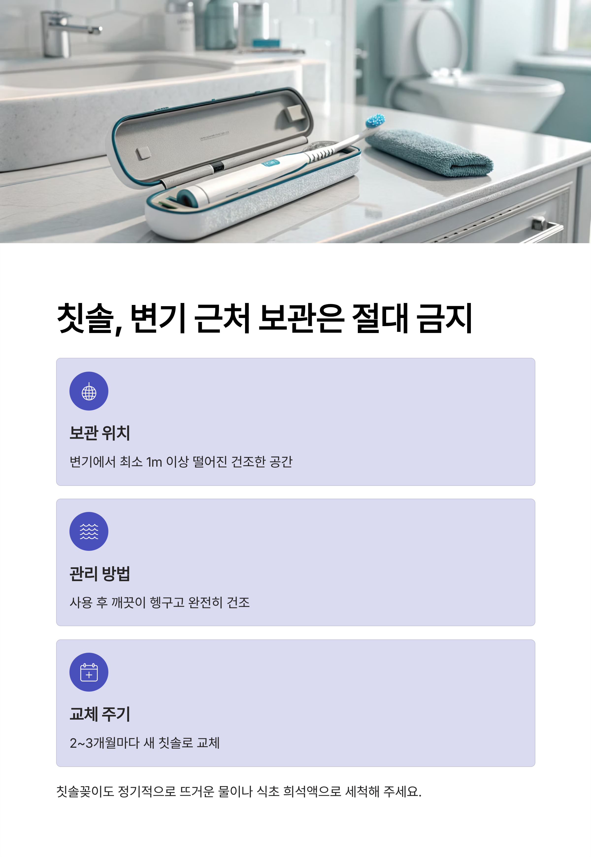 | 칫솔꽂이 | 주 1회 | 뜨거운 물 또는 식초 희석액으로 세척 |