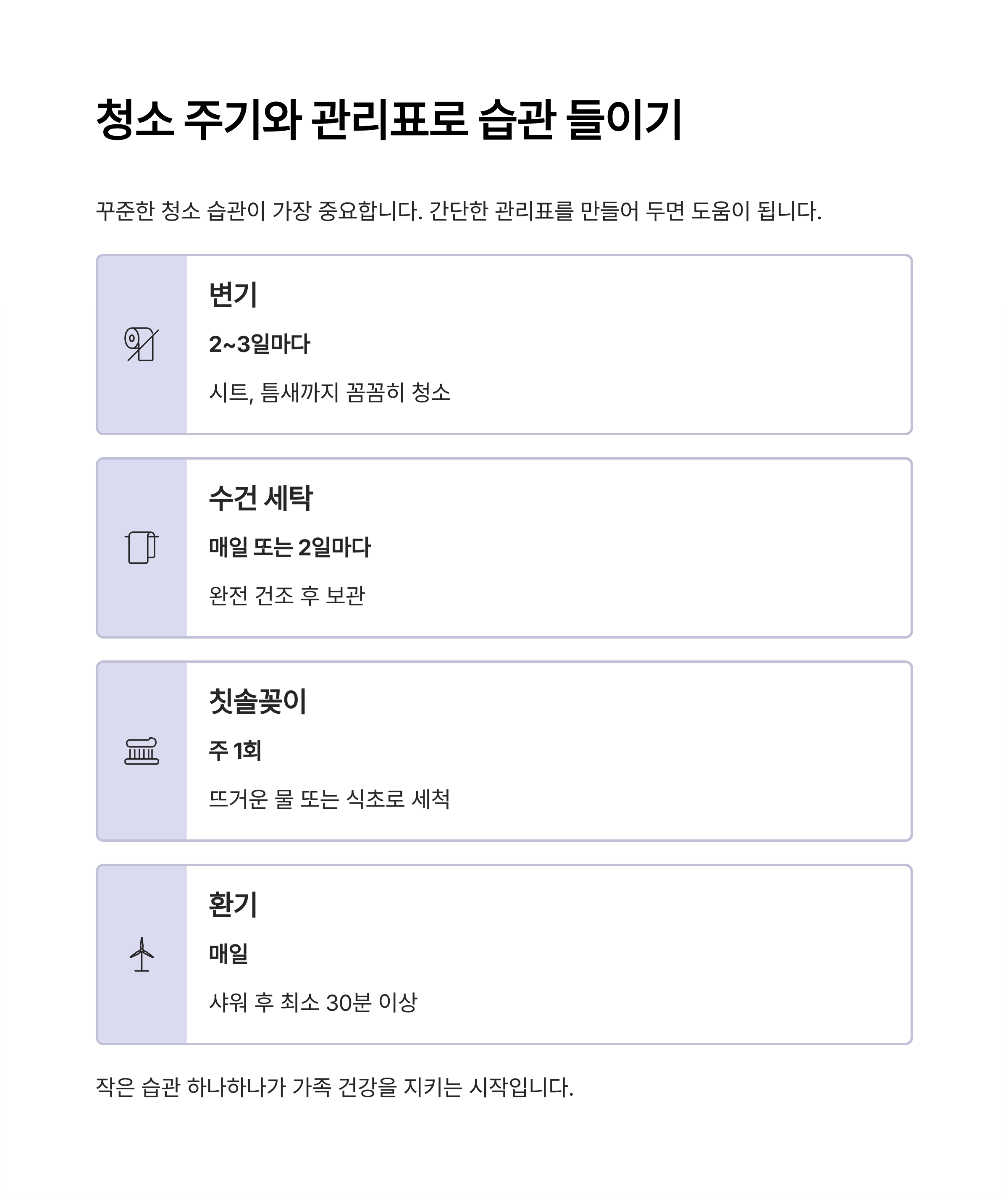 | 변기 | 2~3일마다 | 시트, 틈새까지 꼼꼼히 청소 |