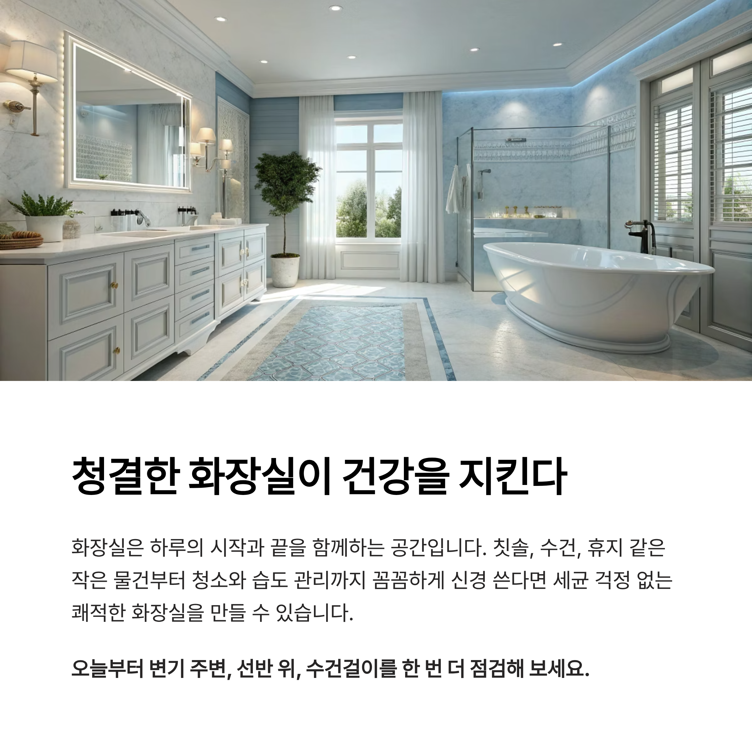 화장실은 하루의 시작과 끝을 함께하는 공간입니다. 칫솔, 수건, 휴지 같은 작은 물건부터 청소와 습도 관리까지 꼼꼼하게 신경 쓴다면 세균 걱정 없는 쾌적한 화장실을 만들 수 있습니다. 오늘부터 변기 주변, 선반 위, 수건걸이를 한 번 더 점검해 보세요.