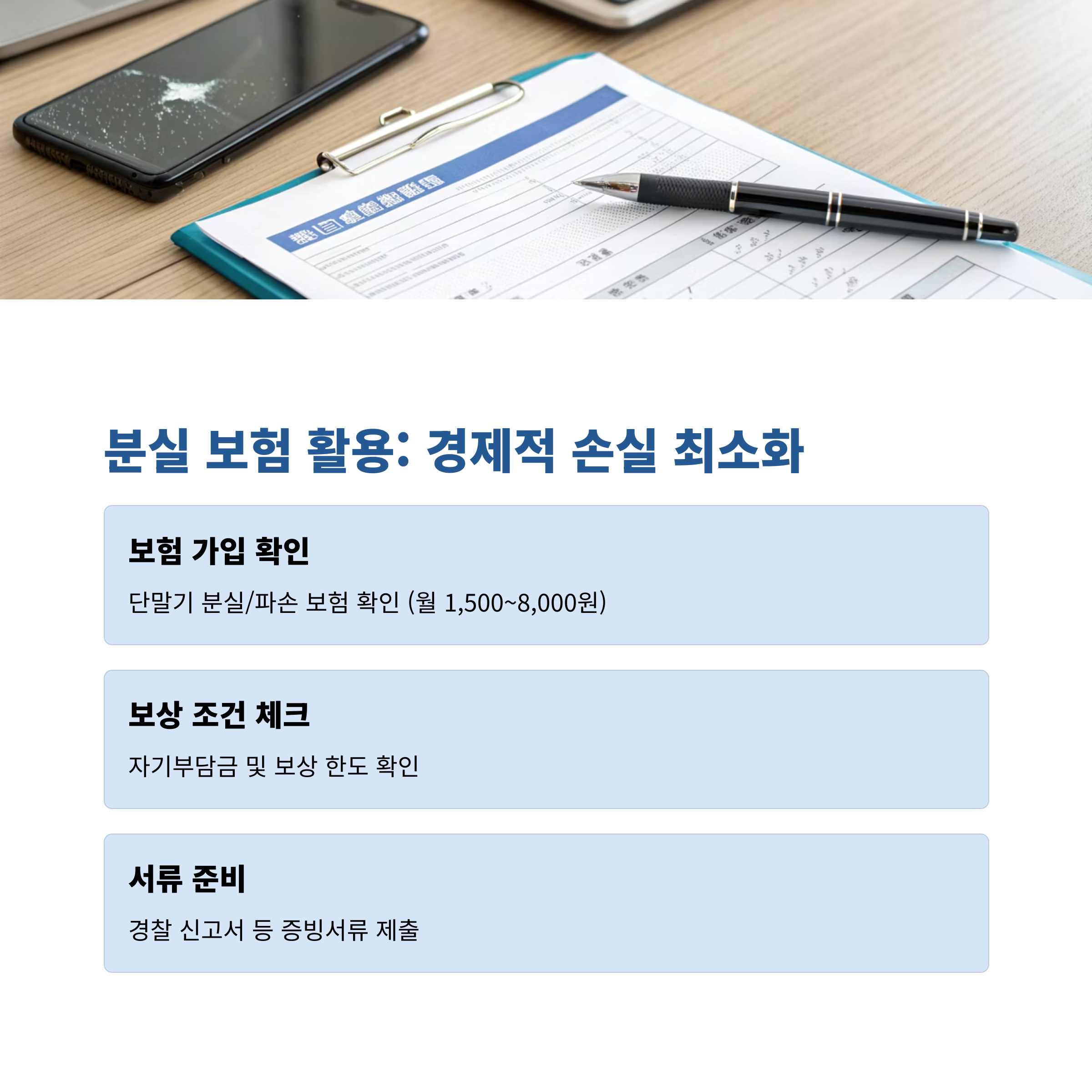 분실신고 접수일, 경찰서 신고 접수증, 통신사 일시정지 내역 등 서류를 제출해야 하며, 자기부담금이 발생할 수 있습니다.