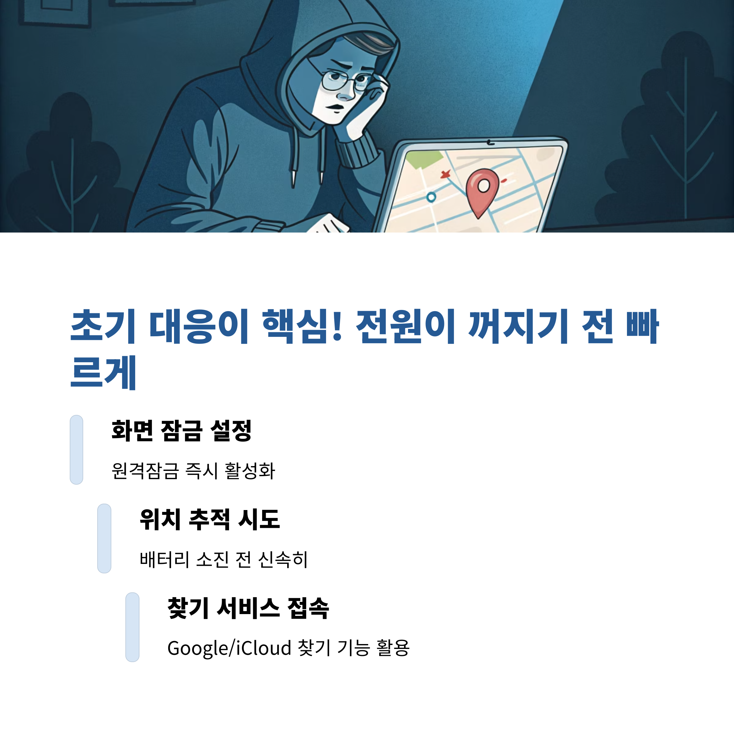 휴대폰을 분실했다는 사실을 인지했다면, **가장 먼저 해야 할 일은 "위치 추적"과 "원격 잠금"입니다.