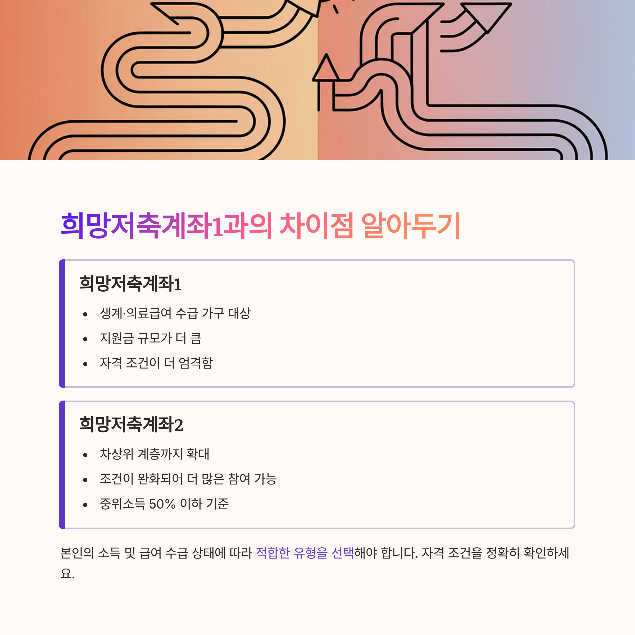 반면 희망저축계좌2는 조건이 완화되어 더 많은 차상위 계층이 참여할 수 있습니다.