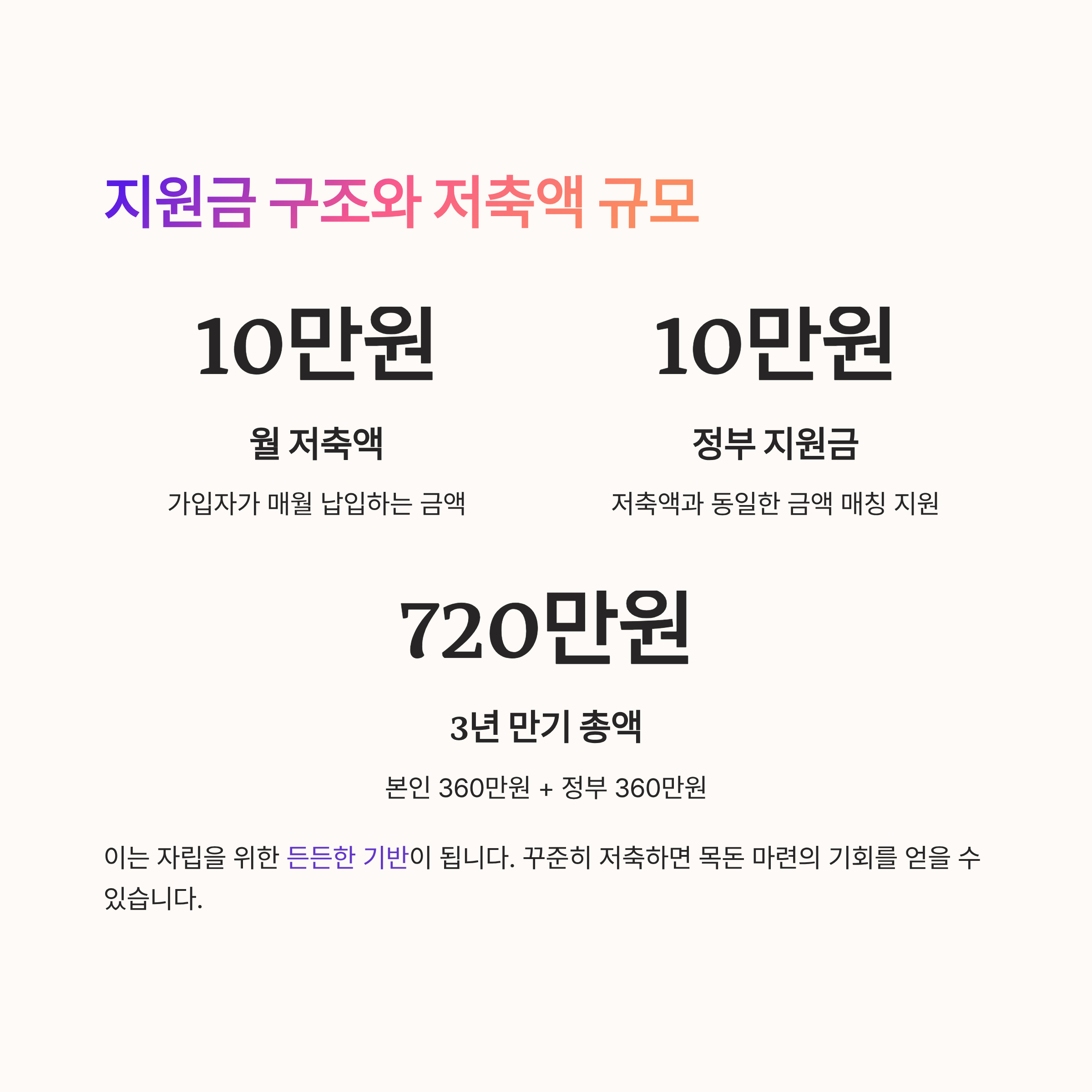 본인이 저축하는 금액에 정부 지원금이 더해져 만기 시 목돈을 마련할 수 있도록 설계된 정책입니다.