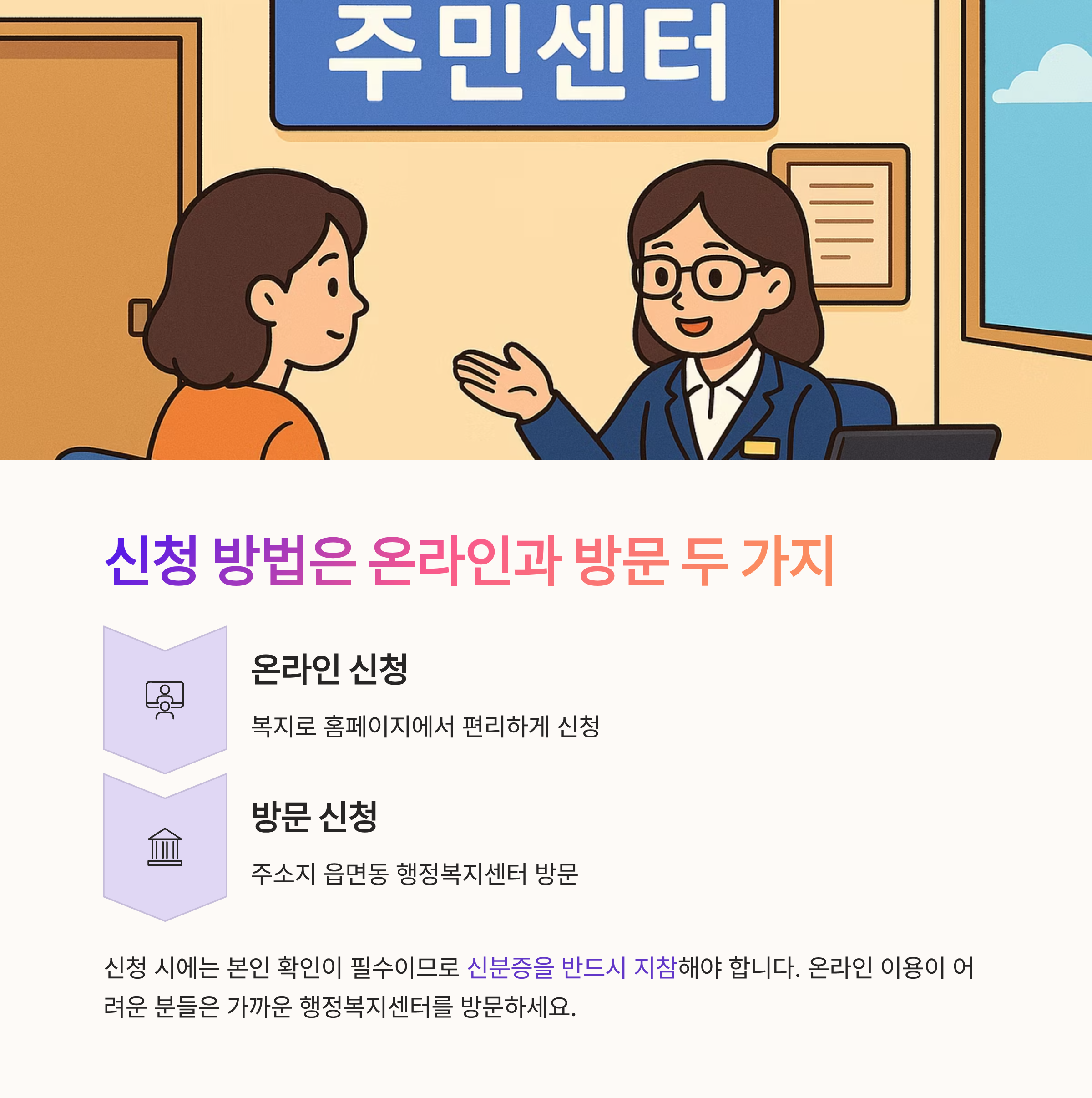 온라인 이용이 어렵다면 주소지 읍면동 행정복지센터를 방문해 직접 신청할 수 있습니다.