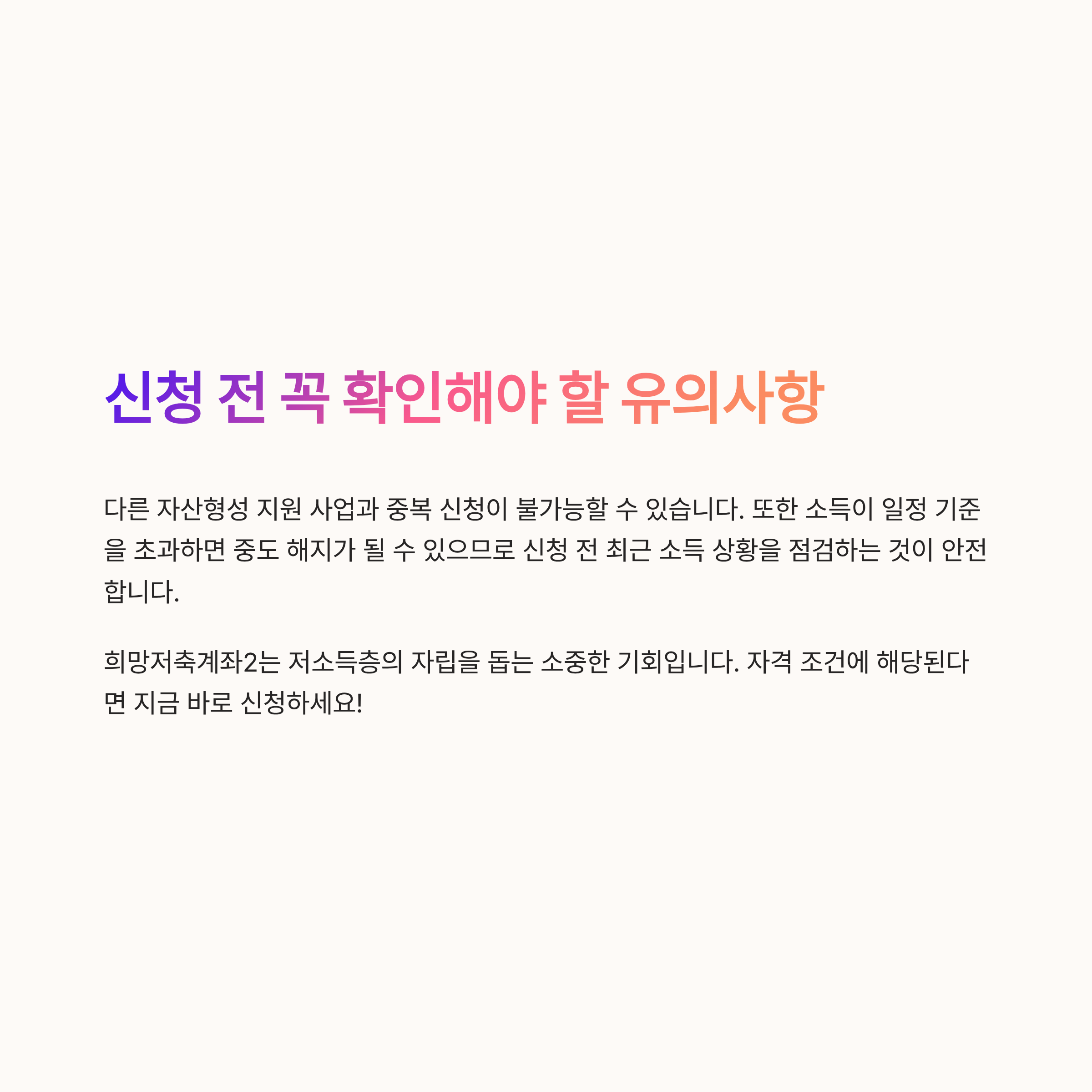 다른 자산형성 지원 사업과 중복 신청이 불가능할 수 있습니다.