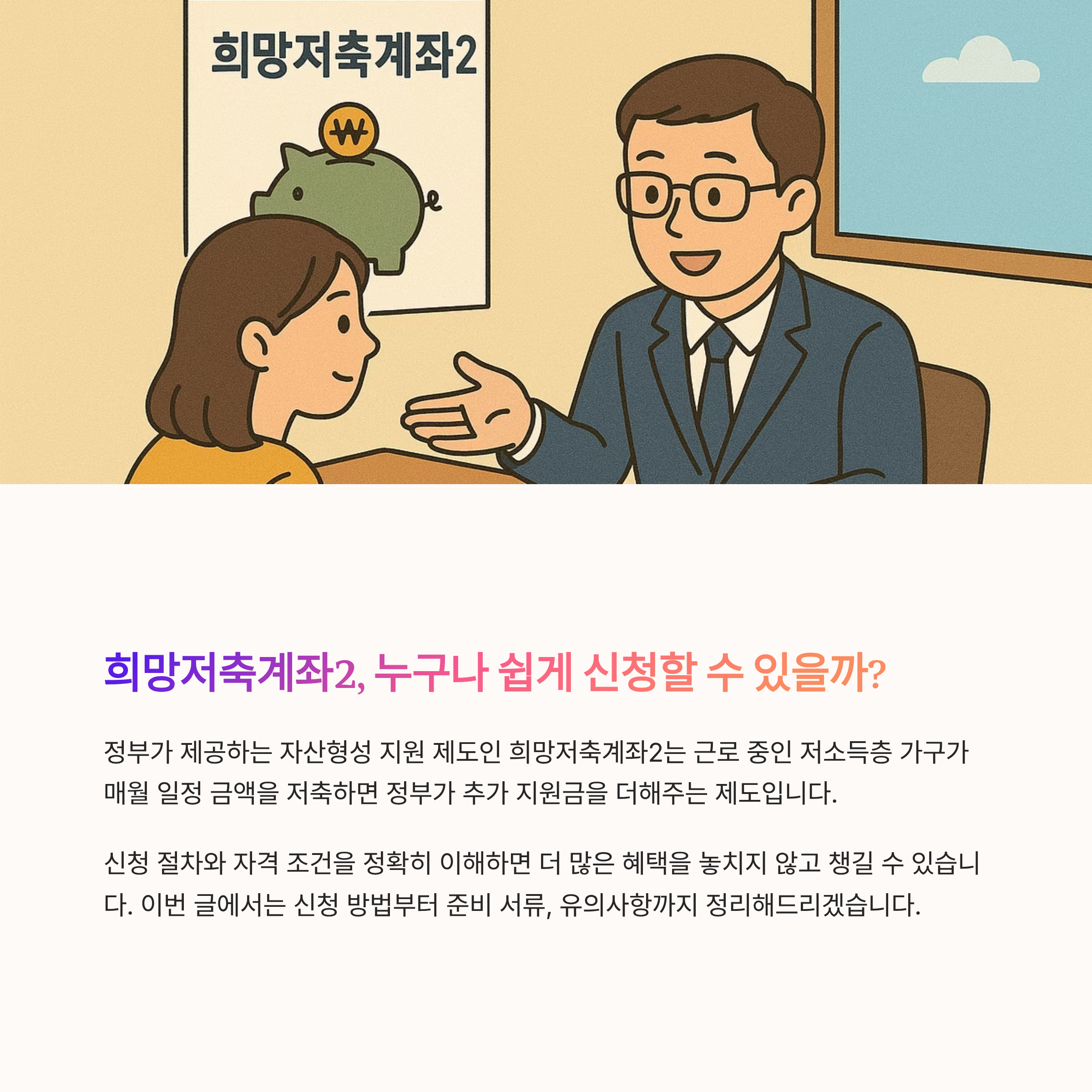 정부가 제공하는 자산형성 지원 제도인 희망저축계좌2는 근로 중인 저소득층 가구가 매월 일정 금액을 저축하면 정부가 추가 지원금을 더해주는 제도입니다. 신청 절차와 자격 조건을 정확히 이해하면 더 많은 혜택을 놓치지 않고 챙길 수 있습니다. 이번 글에서는 신청 방법부터 준비 서류, 유의사항까지 정리해드리겠습니다.