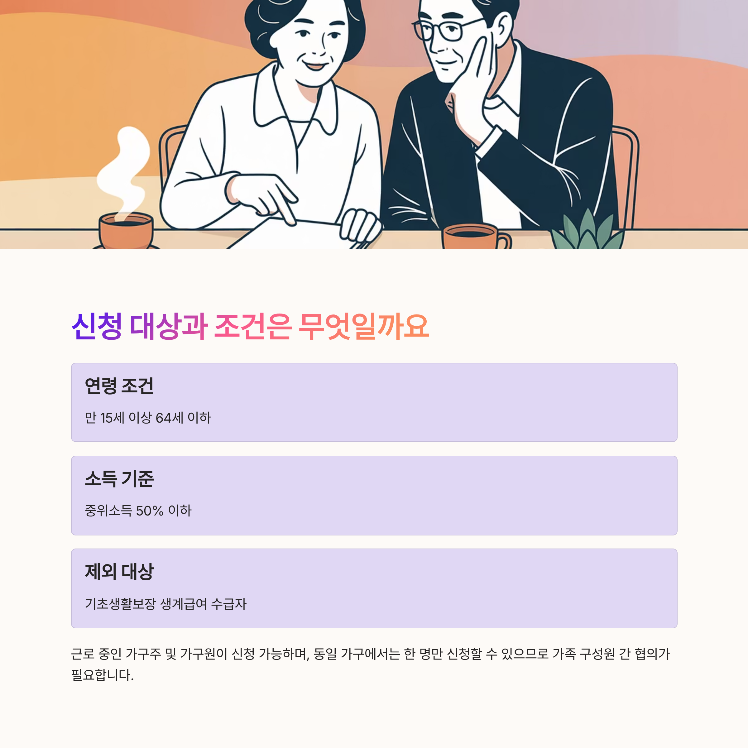 중위소득 50% 이하 기준을 충족해야 하며, 기초생활보장 생계급여 수급자는 제외됩니다.