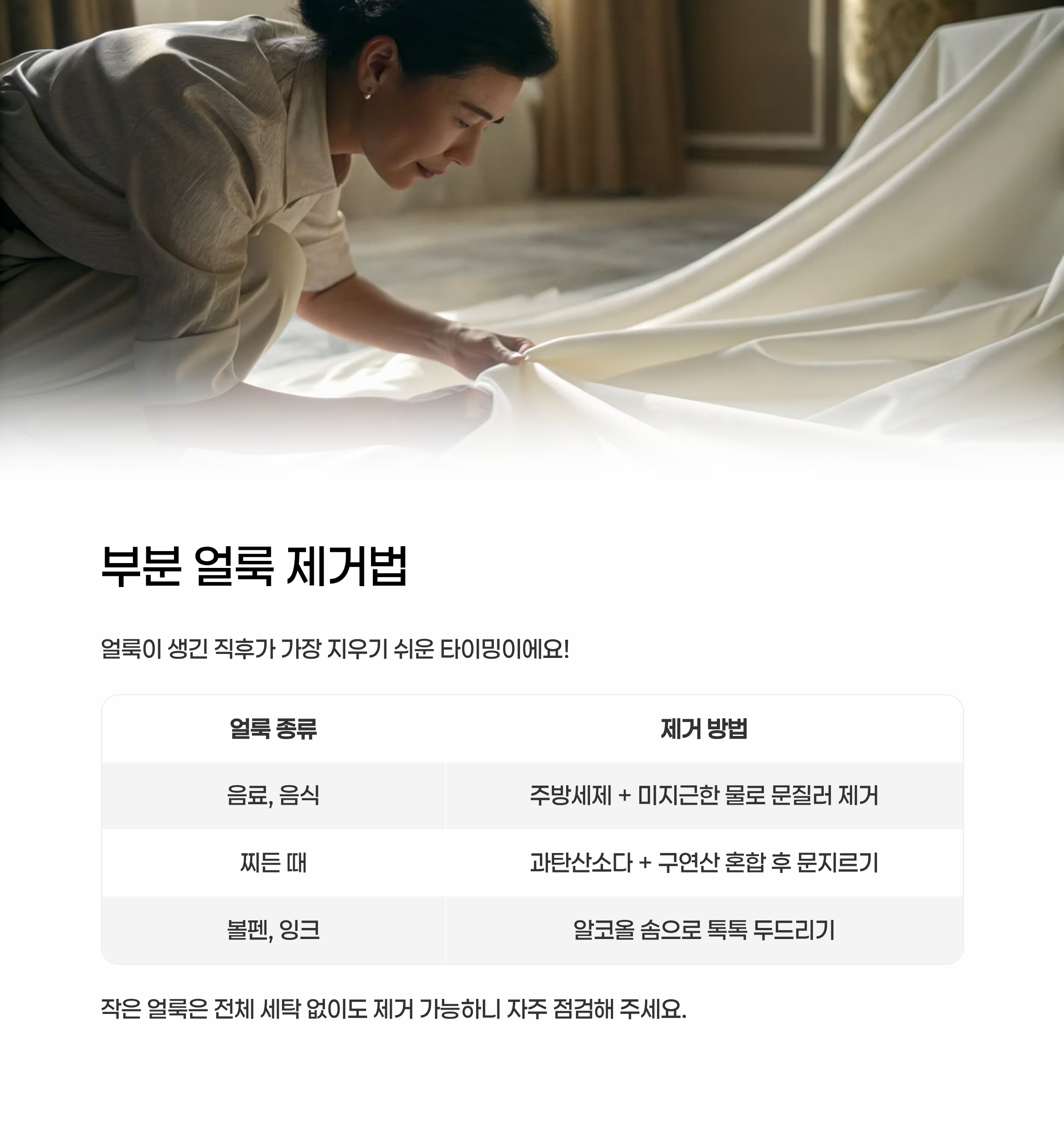 얼룩이 생긴 직후가 가장 지우기 쉬운 타이밍이에요!