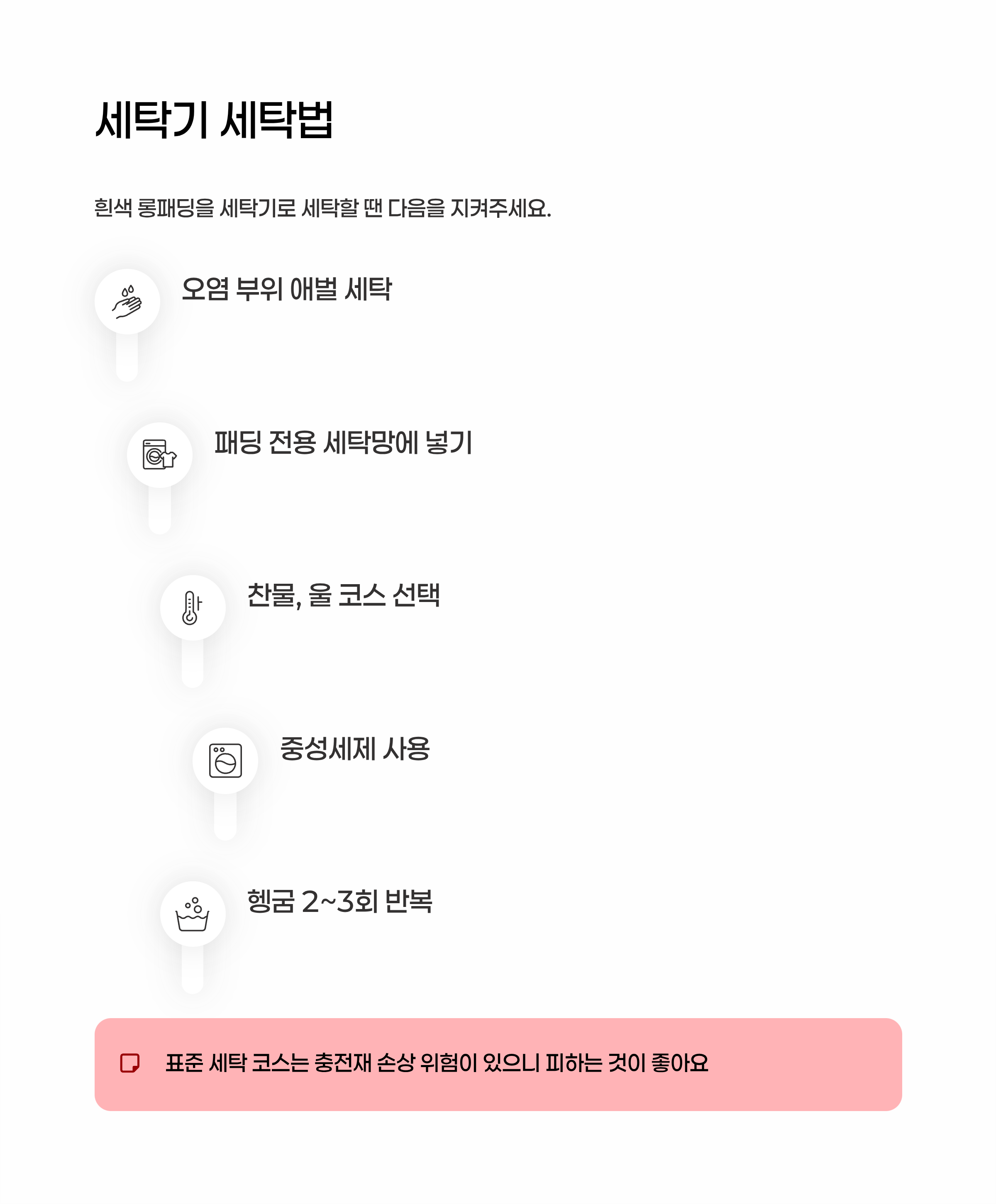 흰색 롱패딩을 세탁기로 세탁할 땐 다음을 지켜주세요.