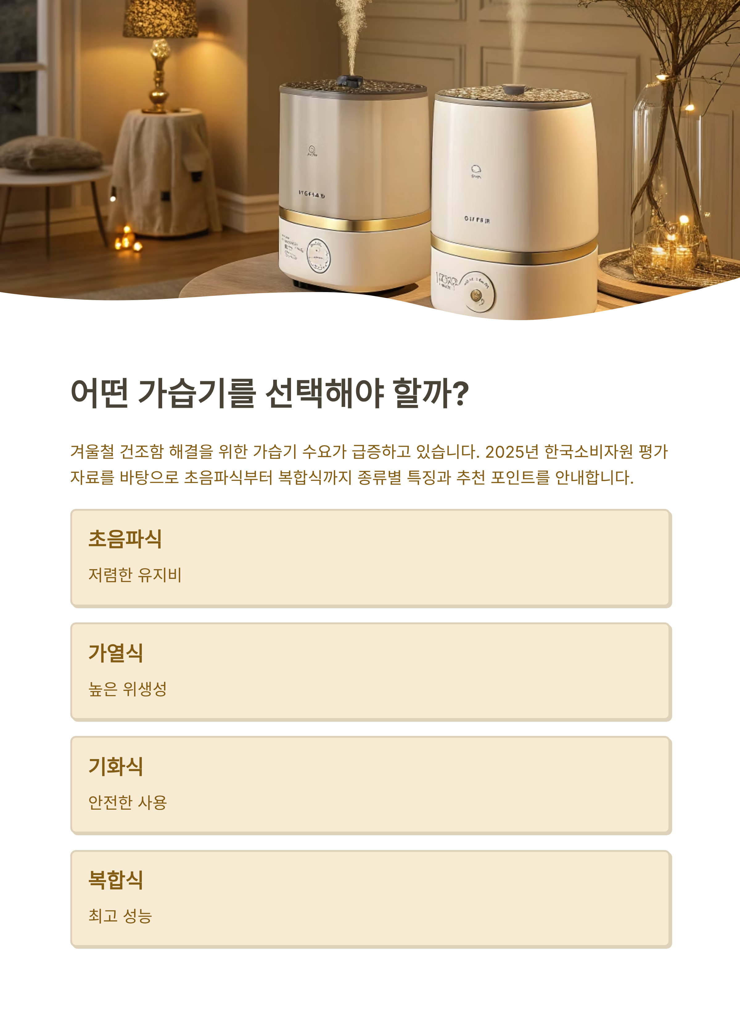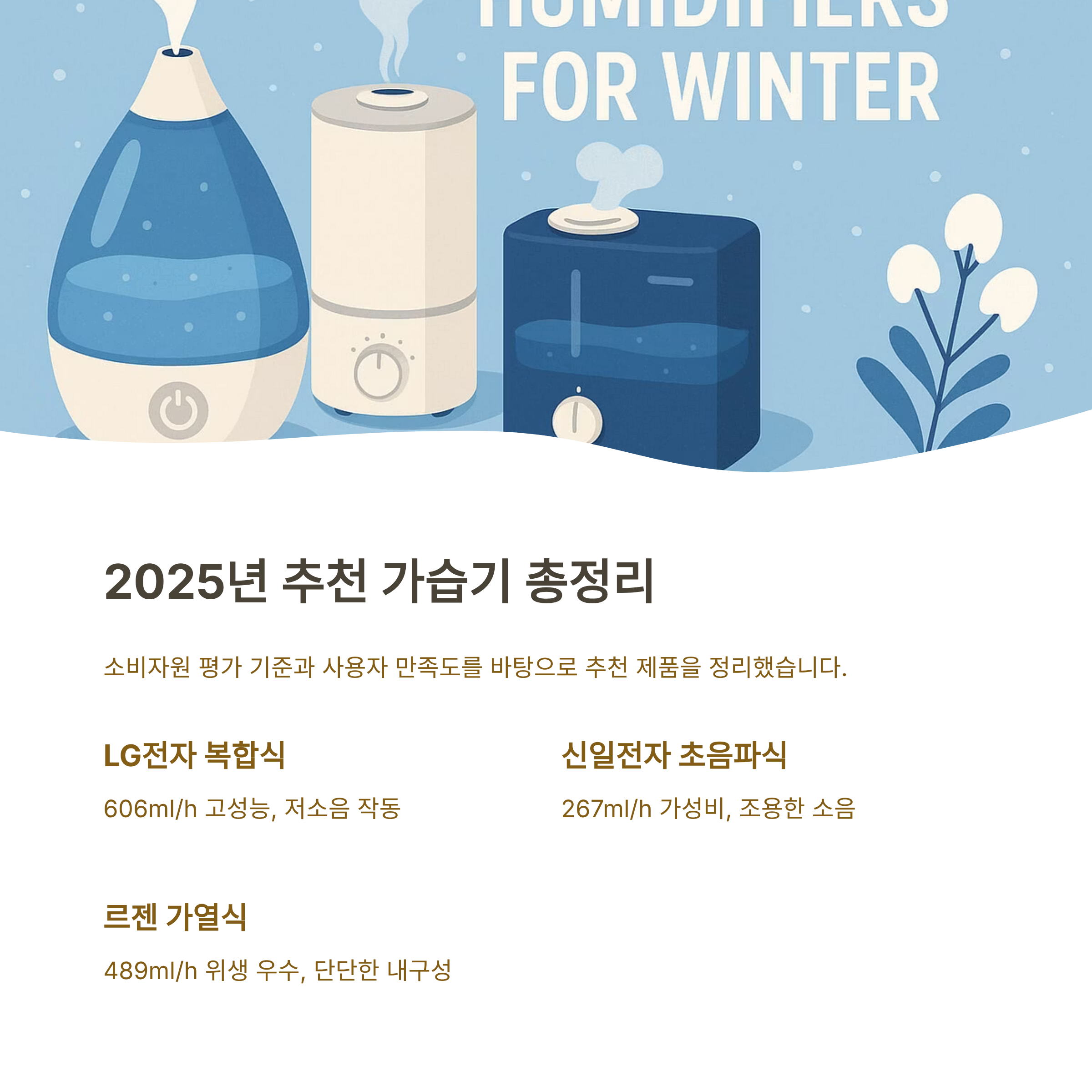 겨울이 다가오면서 건조함을 해결하기 위한 가습기 수요가 크게 늘고 있습니다. 하지만 종류도 너무 다양하고 성능도 제각각이라 고민이 되실 텐데요. 오늘은 2025년 한국소비자원에서 평가한 자료를 바탕으로, 초음파식부터 복합식까지 가습기 종류별 특징과 주요 비교 항목, 추천 포인트까지 꼼꼼하게 안내해드릴게요.