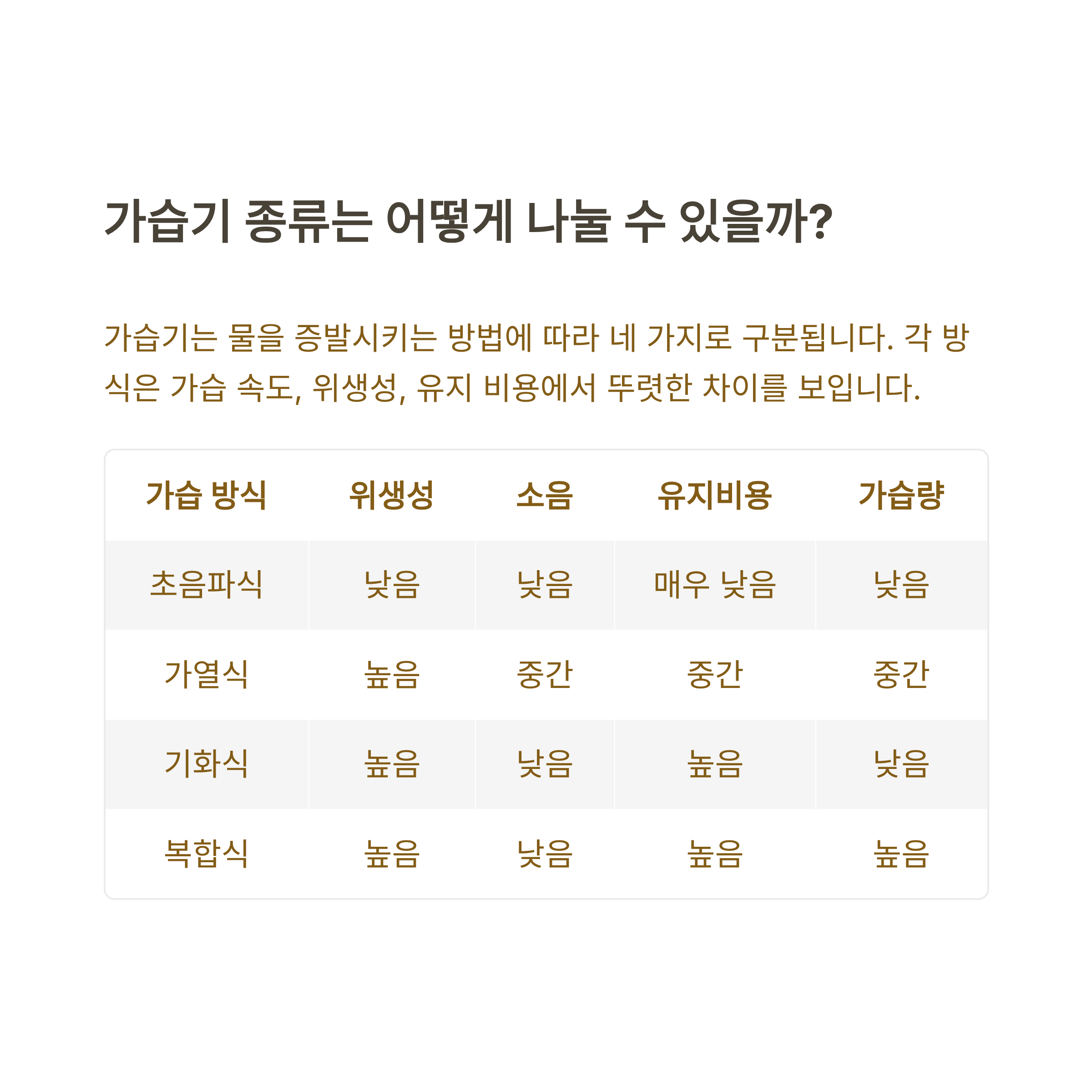 아래 표는 각 가습 방식의 핵심 차이점입니다.