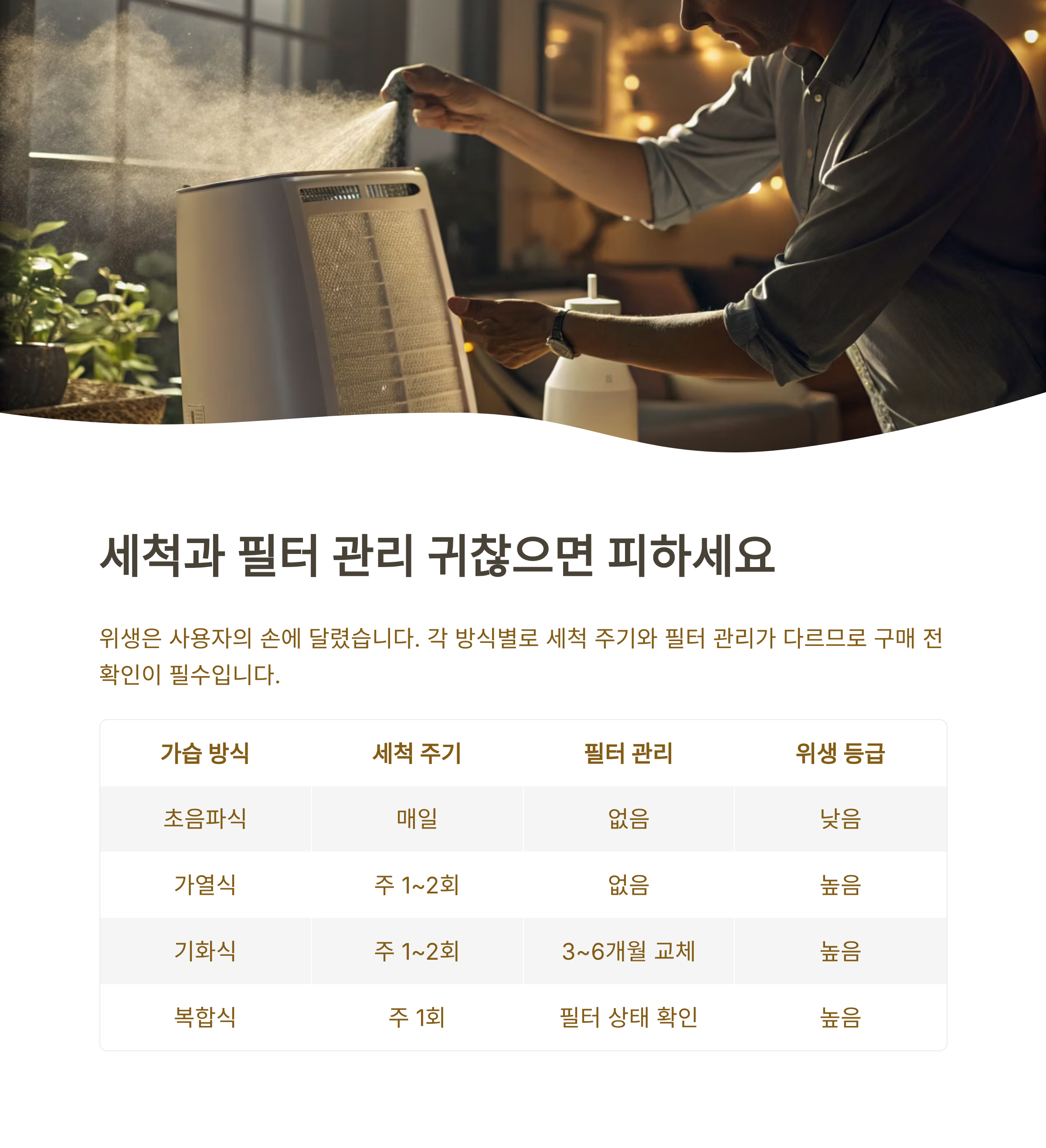 | 가습 방식 | 세척 주기 | 필터 관리 | 위생 등급 |