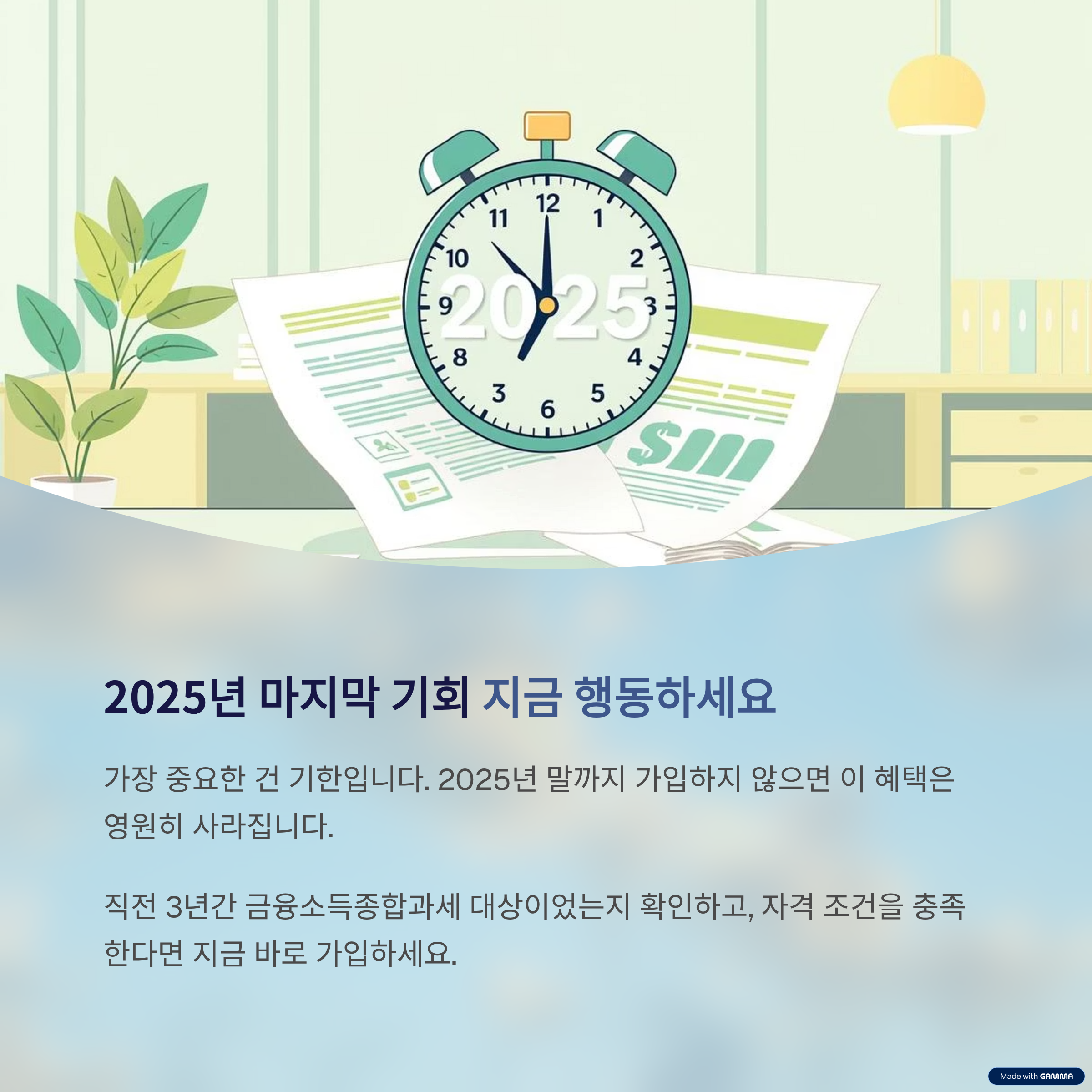 가장 중요한 건 기한입니다. 2025년 말까지 가입하지 않으면 이 혜택은 더 이상 존재하지 않습니다. 또한 직전 3년간 금융소득종합과세 대상이었다면 자격이 제한됩니다. 반드시 가입 조건을 먼저 확인하고 진행해야 합니다.
