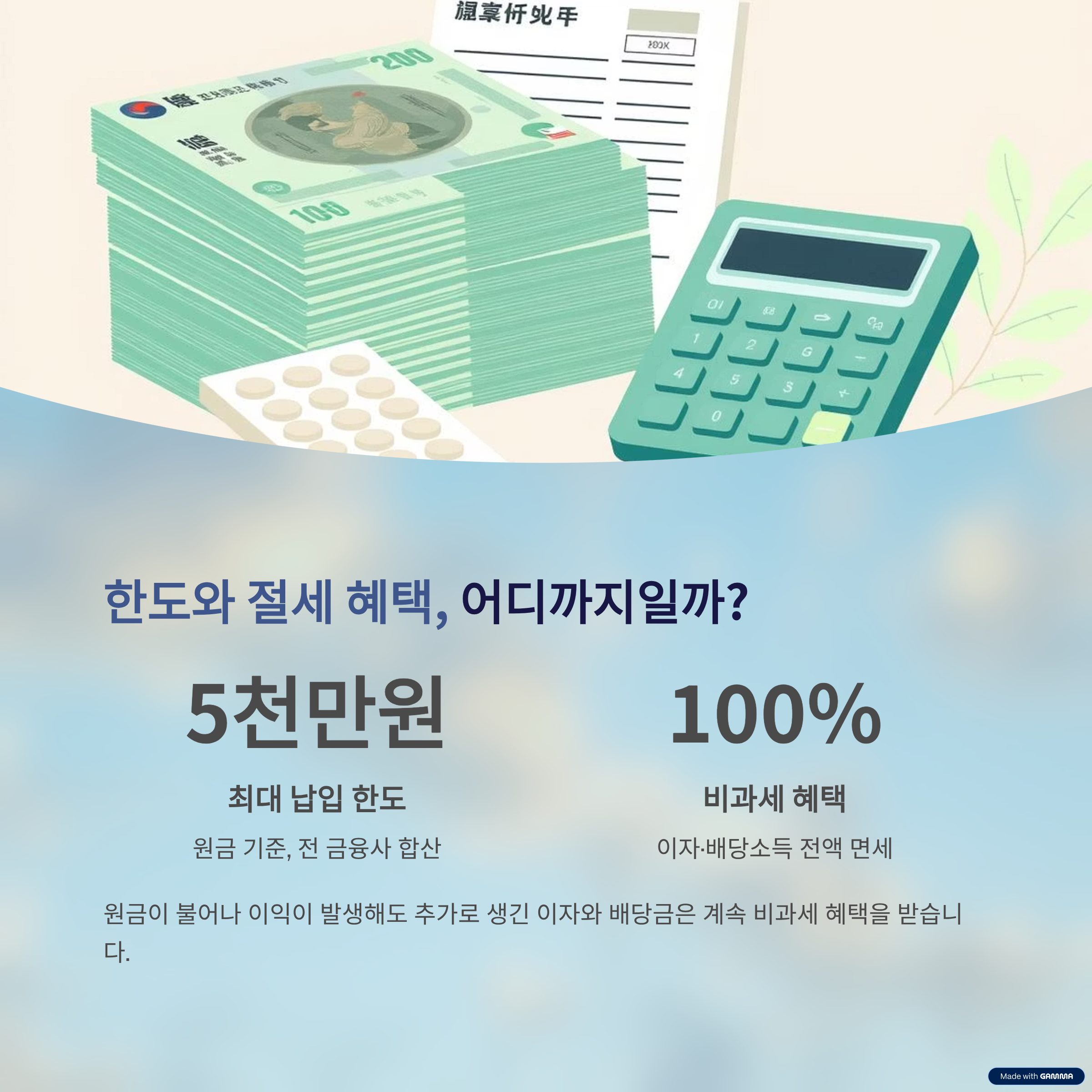 납입 한도는 원금 기준으로 최대 5천만 원입니다. 전 금융사 합산 기준이므로 분산 가입은 불가능합니다. 다만 원금이 불어나 이익이 발생해도 추가로 생긴 이자와 배당금은 계속 비과세 혜택을 받습니다.