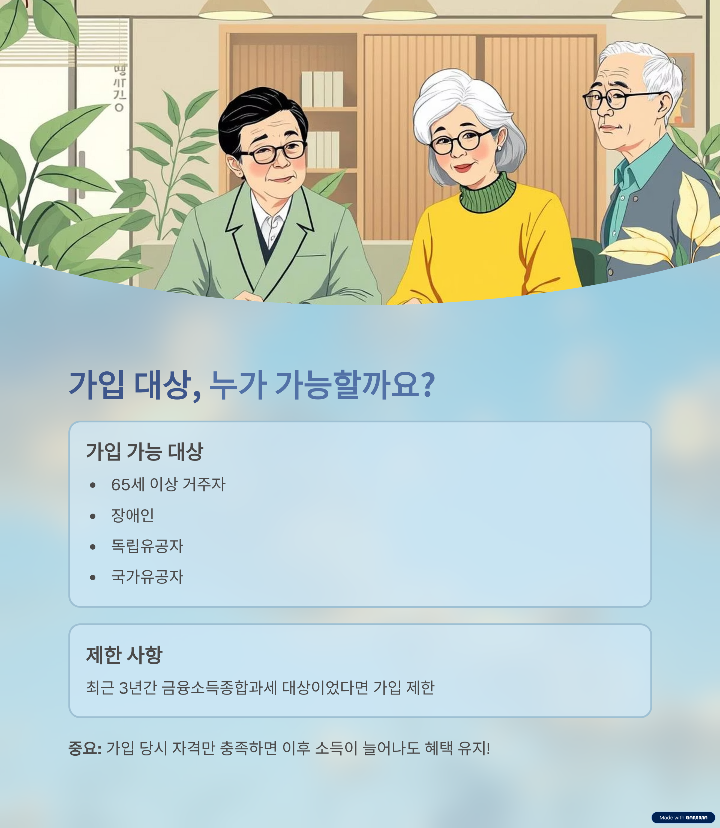 대상은 엄격히 제한되어 있습니다. 65세 이상 거주자, 장애인, 독립유공자, 국가유공자 등이 이에 해당합니다. 단, 최근 3년간 금융소득종합과세 대상이었다면 가입이 제한될 수 있습니다. 중요한 점은 가입 당시 자격 요건만 충족하면 이후 소득이 늘어나도 혜택은 그대로 유지된다는 사실입니다.
