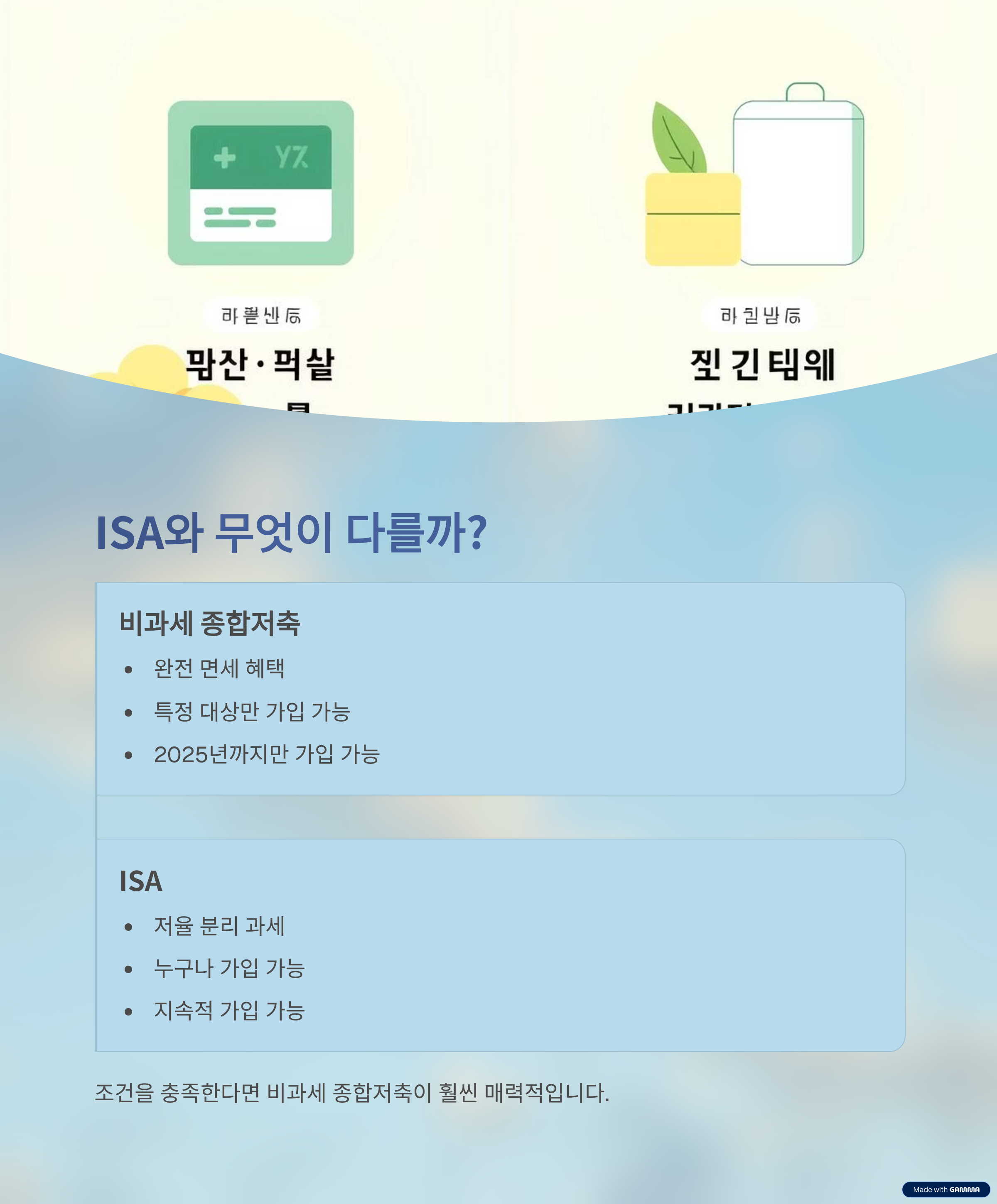 ISA는 저율 분리 과세를 제공하지만, 비과세 종합저축처럼 완전 면세 혜택은 아닙니다. 또한 ISA는 누구나 가입 가능하지만, 비과세 종합저축은 특정 대상만 가입할 수 있는 제한이 있습니다. 따라서 조건을 충족한다면 비과세 종합저축이 훨씬 매력적입니다.