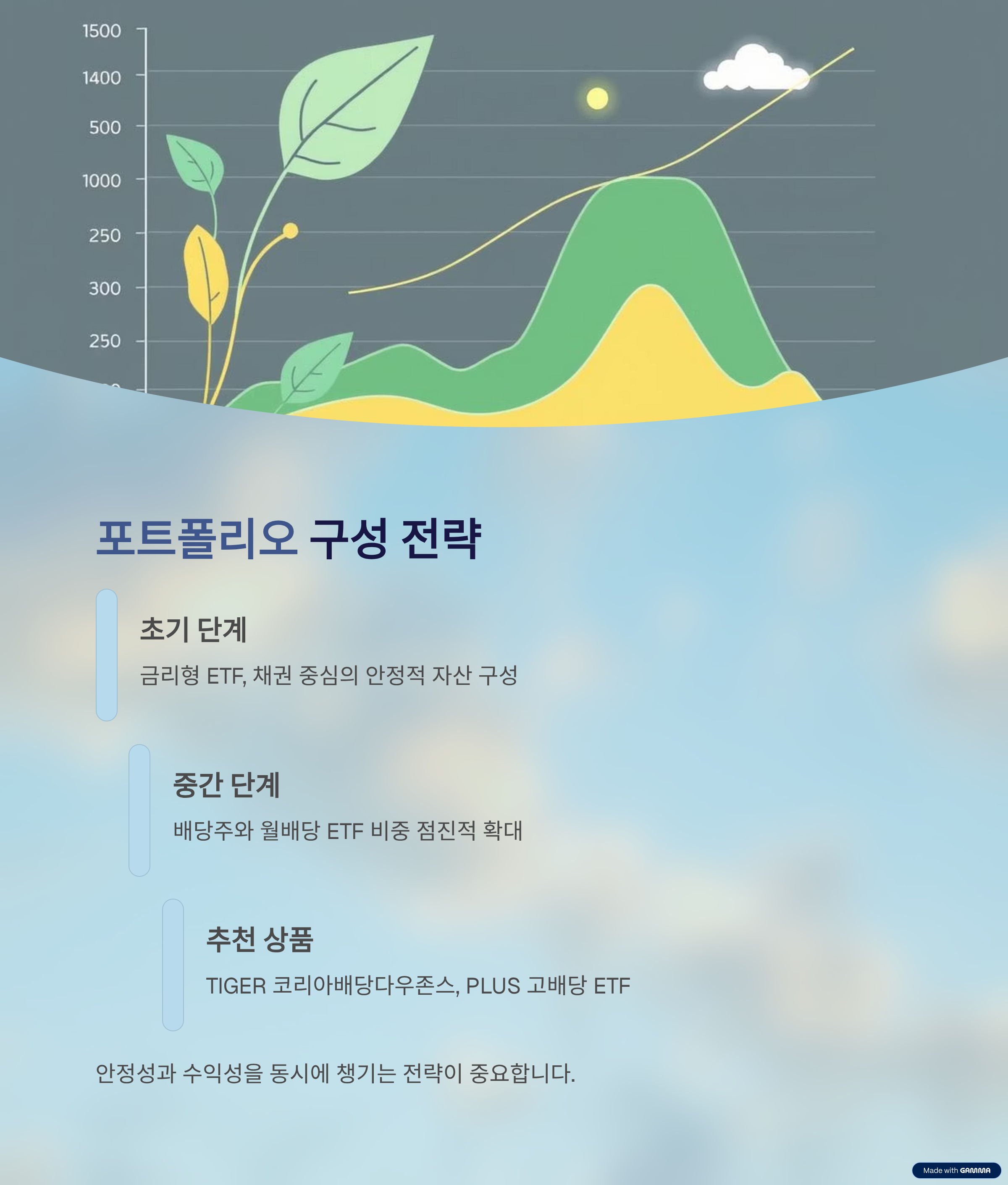 처음에는 금리형 ETF나 채권 중심으로 안정적인 자산을 담고, 점차 배당주와 월배당 ETF 비중을 늘려가는 것이 좋습니다. 예를 들어 배당형 ETF인 TIGER 코리아배당다우존스, PLUS 고배당 ETF 등이 대표적인 선택지입니다. 이렇게 하면 안정성과 수익성을 동시에 챙길 수 있습니다.