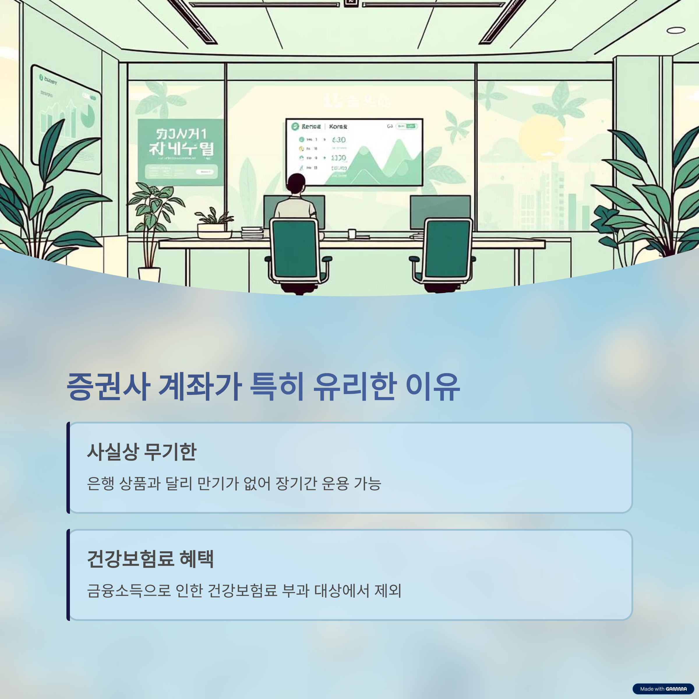 증권사 계좌의 장점은 만기가 사실상 없다는 것입니다. 은행 상품은 만기가 도래하면 재가입 절차가 필요하지만, 증권사는 장기간 운용이 가능해 더 안정적입니다. 또한 금융소득으로 인한 건강보험료 부과 대상에서도 제외되어 부담을 줄일 수 있습니다.