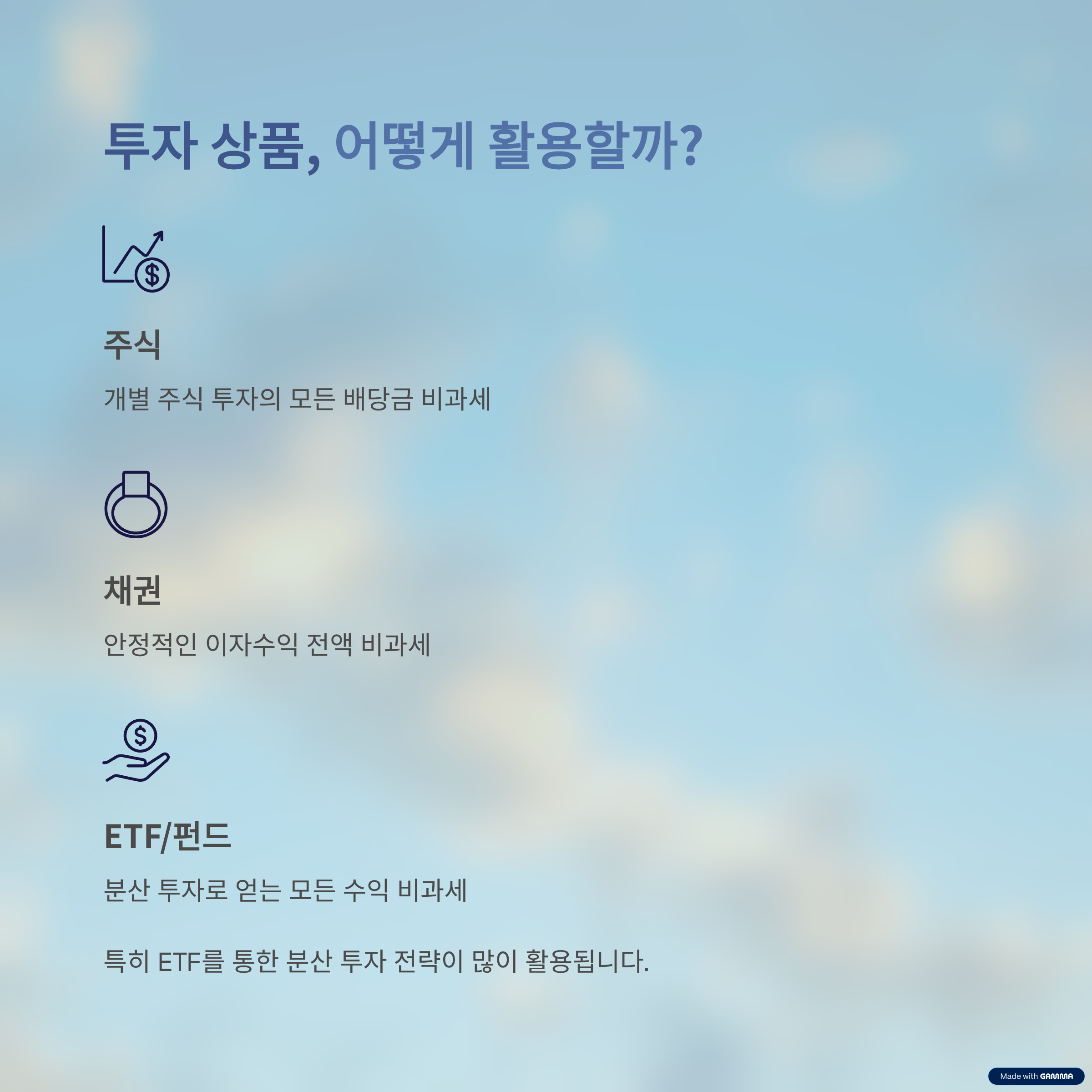 비과세 종합저축 계좌는 단순 예금이 아니라 다양한 투자 상품에 적용됩니다. 주식, 채권, 펀드, ETF 모두 투자 가능하며, 발생하는 수익 또한 전부 비과세입니다. 특히 ETF를 통한 분산 투자 전략이 많이 활용됩니다.
