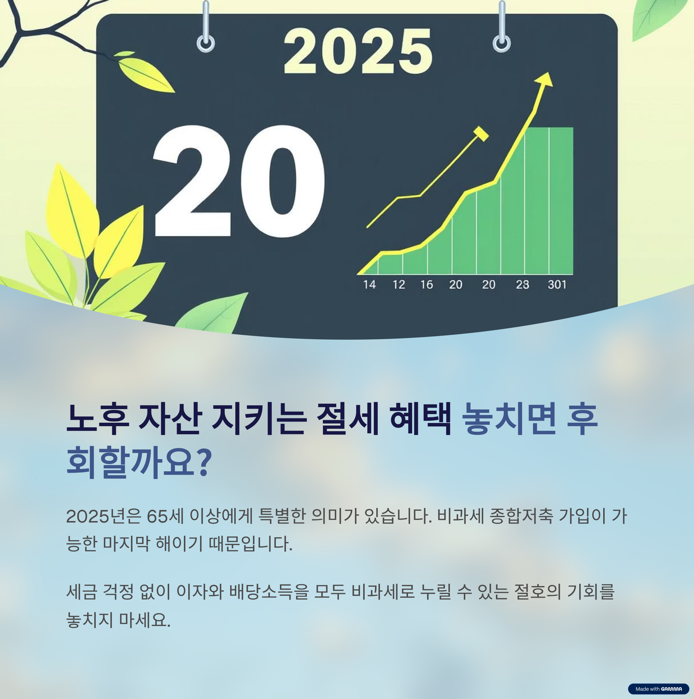 2025년은 65세 이상에게 특별한 의미가 있습니다. 바로 비과세 종합저축 가입이 가능한 마지막 해이기 때문인데요. 세금 걱정 없이 이자와 배당소득을 모두 비과세로 누릴 수 있는 절호의 기회입니다. 이번 글에서는 비과세 종합저축의 조건과 혜택, 활용법까지 꼼꼼히 살펴보며 안정적인 노후 자산 관리 전략을 함께 나눠보겠습니다.