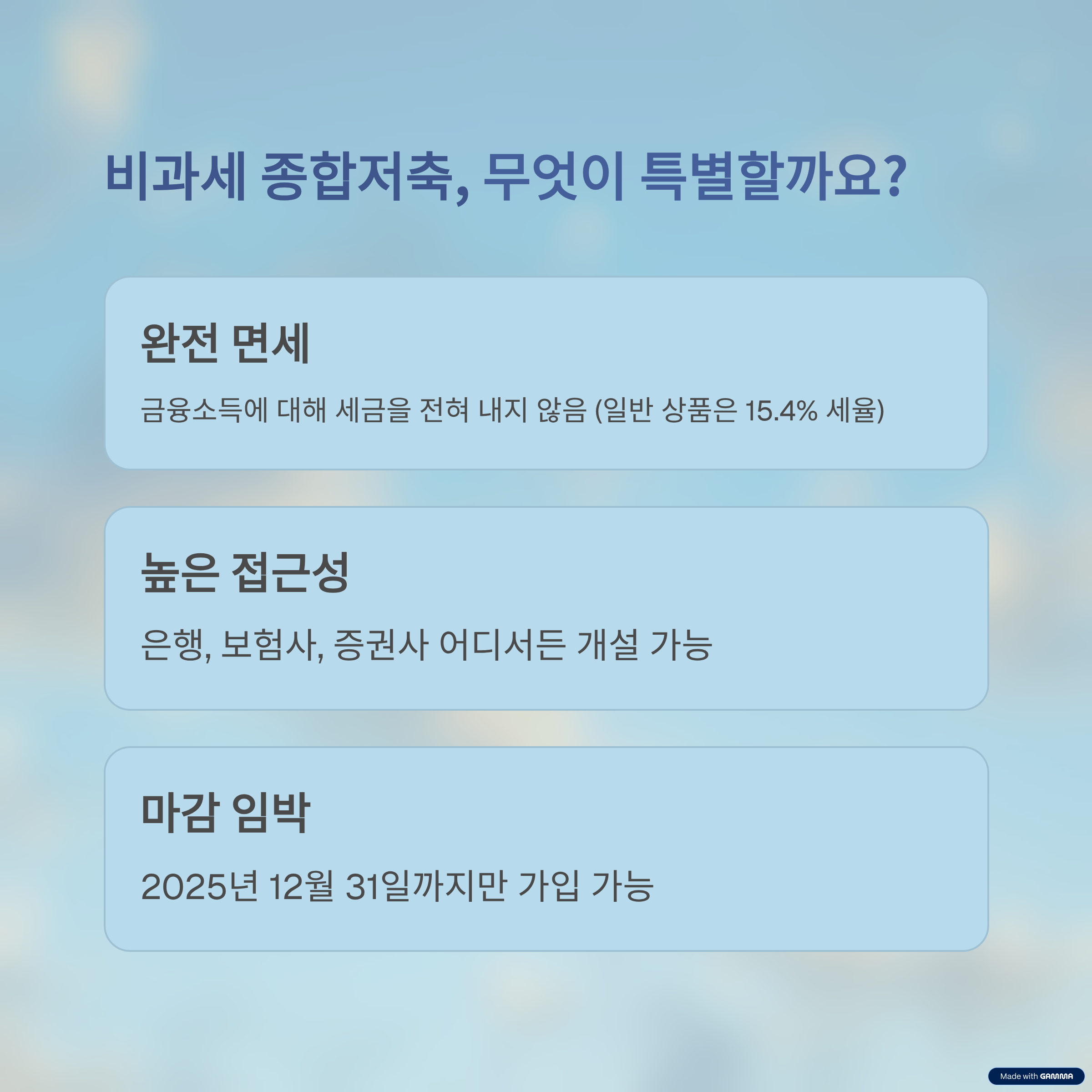 비과세 종합저축은 금융소득에 대해 세금을 전혀 내지 않아도 되는 금융 상품입니다. 일반적인 상품은 이자나 배당에 15.4% 세율이 적용되지만, 이 상품은 전액 면세입니다. 게다가 은행, 보험사, 증권사 어디서든 개설할 수 있어 접근성도 높습니다. 2025년 12월 31일까지 가입해야만 혜택을 누릴 수 있다는 점이 핵심 포인트입니다.