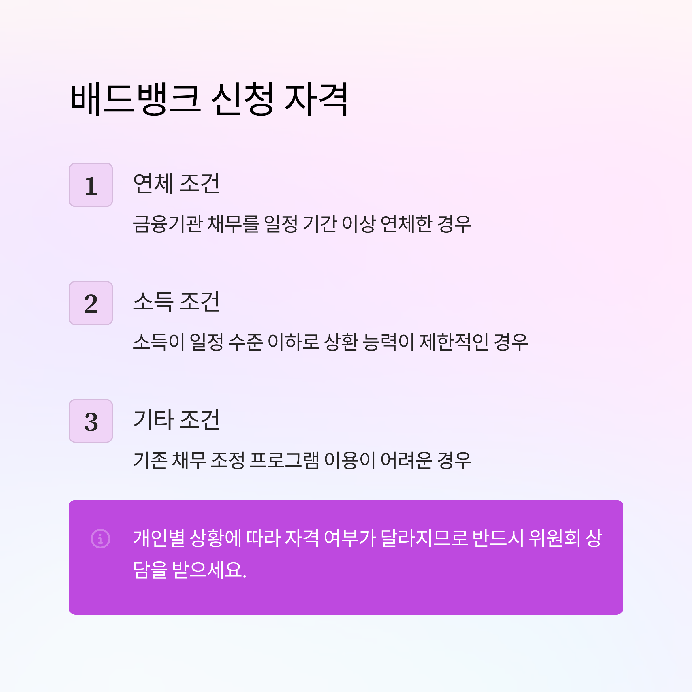 배드뱅크 신청은 모든 채무자가 가능한 것은 아니며, 신용회복위원회가 정한 일정 기준을 충족해야 합니다. 대표적인 자격 조건은 다음과 같습니다.