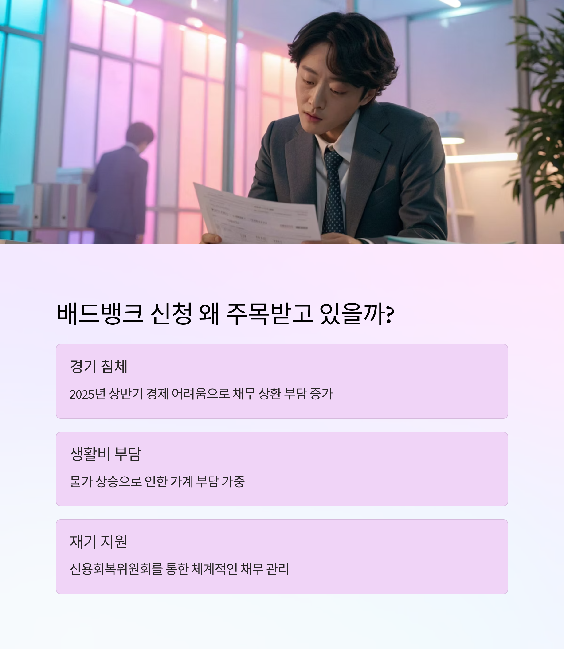 2025년 상반기, 경기 침체와 생활비 부담으로 인해 채무 상환이 어려운 분들이 늘어나면서 ‘배드뱅크 신청’에 대한 관심이 급증하고 있습니다. 배드뱅크 제도는 신용회복위원회를 통해 부실채권을 관리하고 채무자의 재기를 돕는 제도로, 신청 방법과 자격 요건, 신청 시 주의할 점을 반드시 확인해야 합니다.
