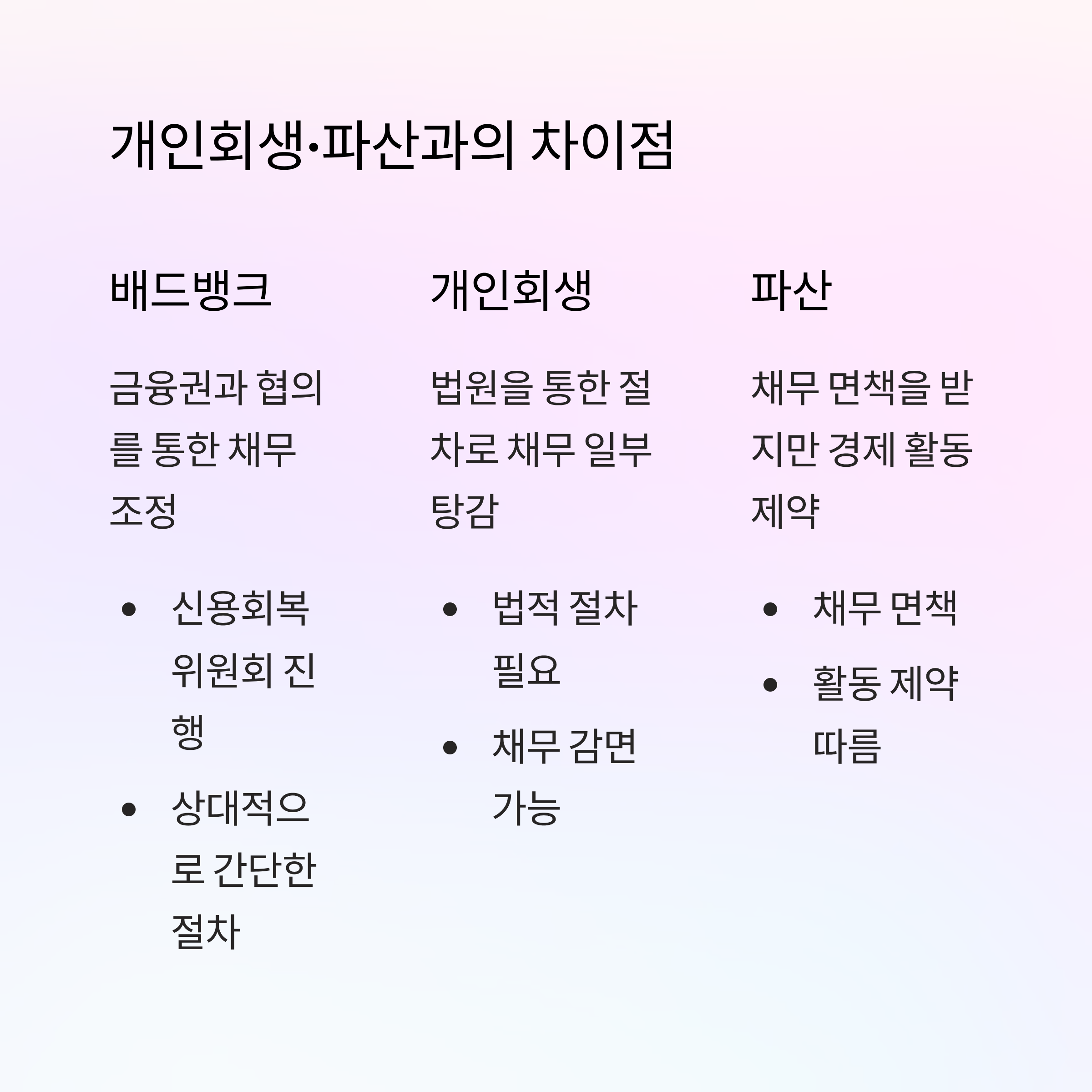 배드뱅크 제도는 개인회생이나 파산과는 다른 제도입니다. 개인회생은 법원을 통한 절차로 채무 일부를 탕감받을 수 있고, 파산은 채무 면책을 받지만 경제 활동 제약이 따릅니다. 반면 배드뱅크는 금융권과 협의를 통해 채무 조정을 진행한다는 점에서 차이가 있습니다.