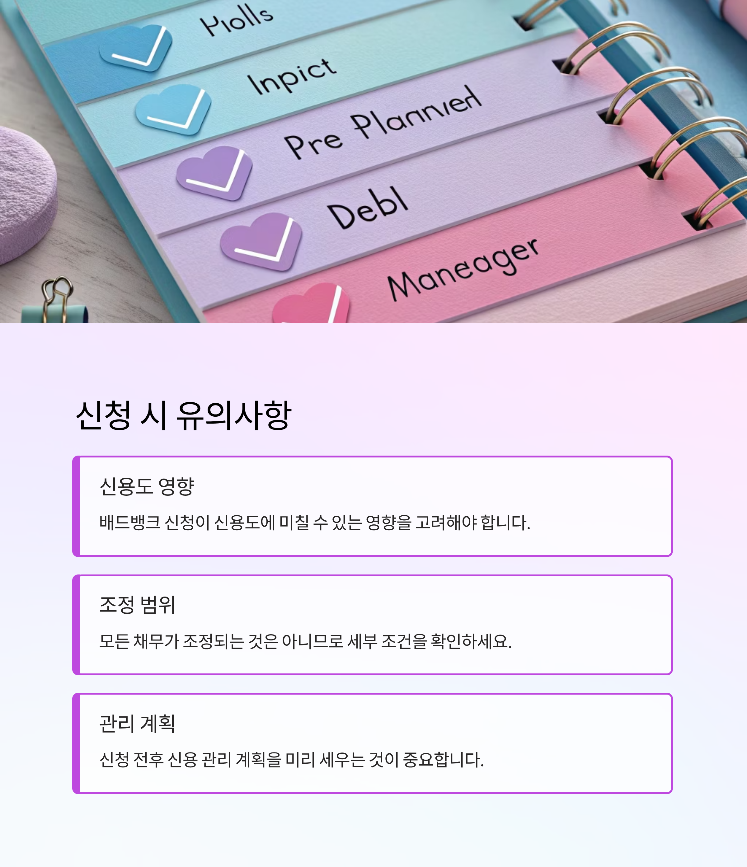 배드뱅크를 신청하면 채무 조정 혜택을 받을 수 있지만, 신용도에 영향을 미칠 수 있다는 점을 반드시 고려해야 합니다. 또한, 모든 채무가 조정되는 것은 아니므로 세부 조건을 꼼꼼히 확인해야 하며, 신청 전후 신용 관리 계획을 세우는 것이 중요합니다.