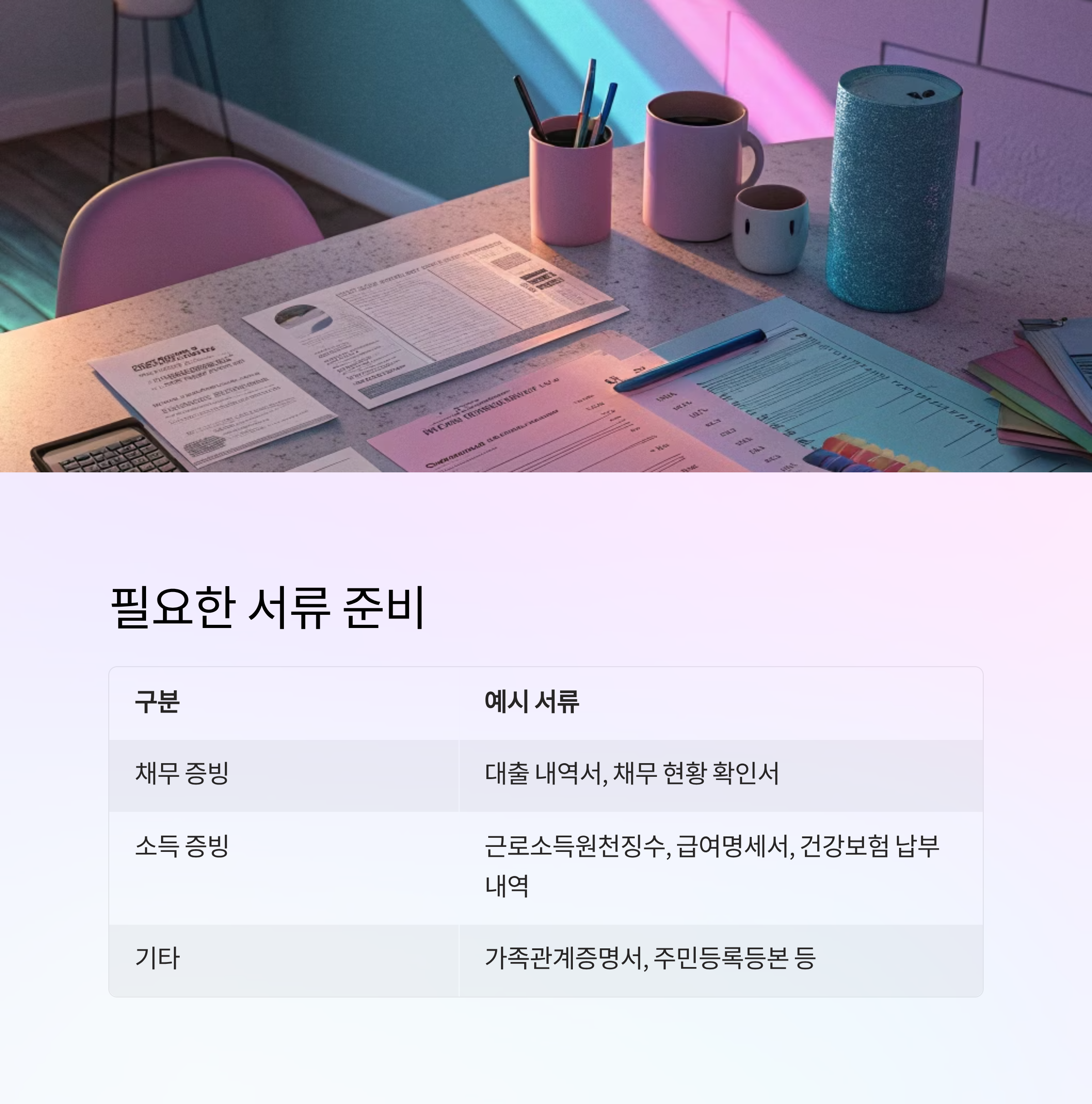 신청 과정에서 요구되는 주요 서류는 채무자의 재정 상황을 증빙하는 자료입니다. 일반적으로 다음과 같은 서류가 필요합니다.