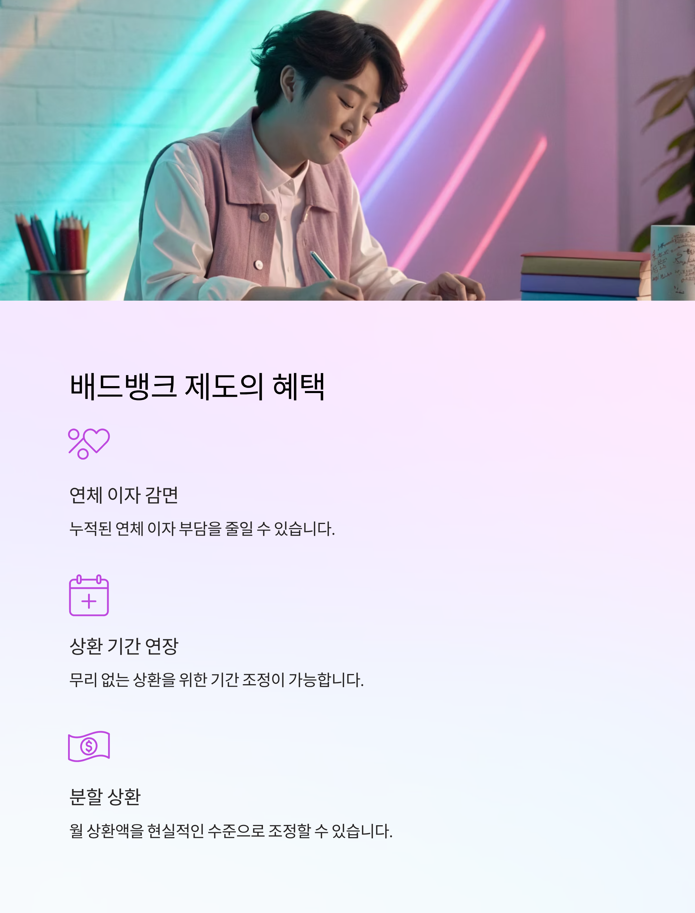 배드뱅크를 통해 채무 조정이 이루어지면 연체 이자 감면, 상환 기간 연장, 분할 상환 등의 혜택을 받을 수 있습니다. 이를 통해 단기적으로 채무 부담을 줄이고 장기적으로 신용 회복을 도모할 수 있습니다.