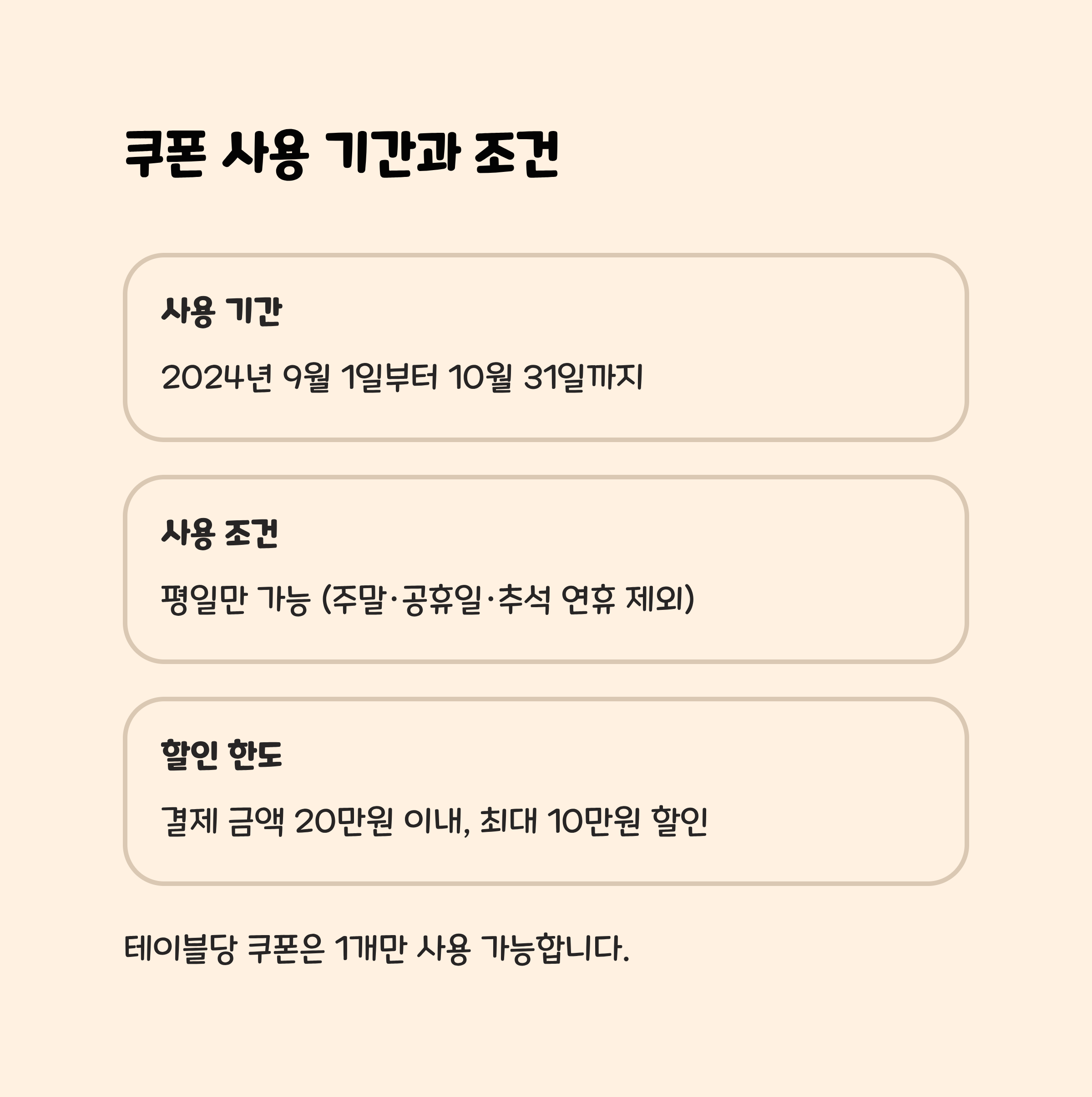 다운로드한 쿠폰은 2024년 9월 1일부터 10월 31일까지 사용할 수 있습니다. 단, 주말·공휴일·추석 연휴에는 사용할 수 없으며, 평일에만 적용됩니다.
