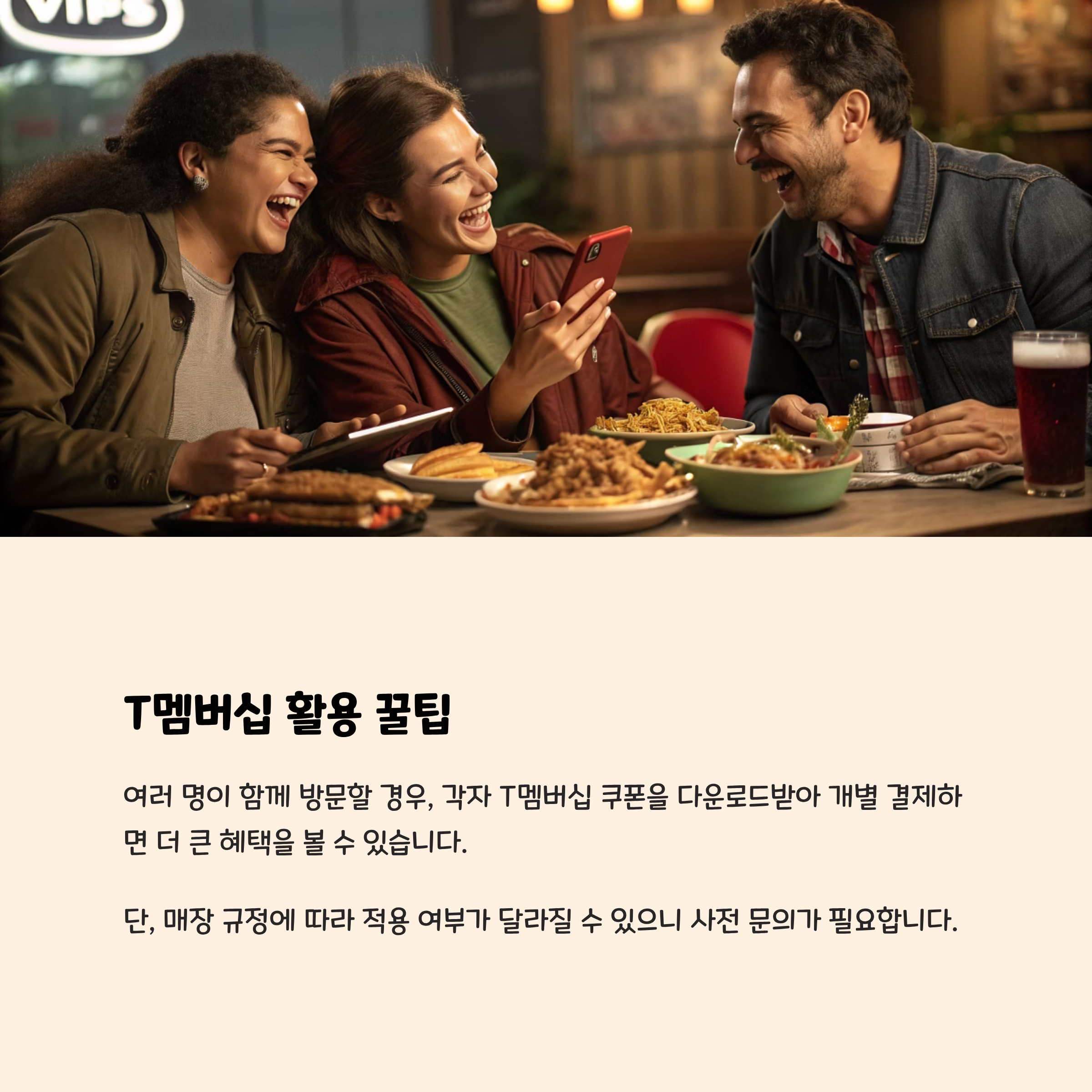 여러 명이 함께 방문할 경우, 각자 T멤버십 쿠폰을 다운로드받아 개별 결제하면 더 큰 혜택을 볼 수 있습니다. 다만, 매장 규정에 따라 적용 여부가 달라질 수 있으니 사전 문의가 필요합니다.