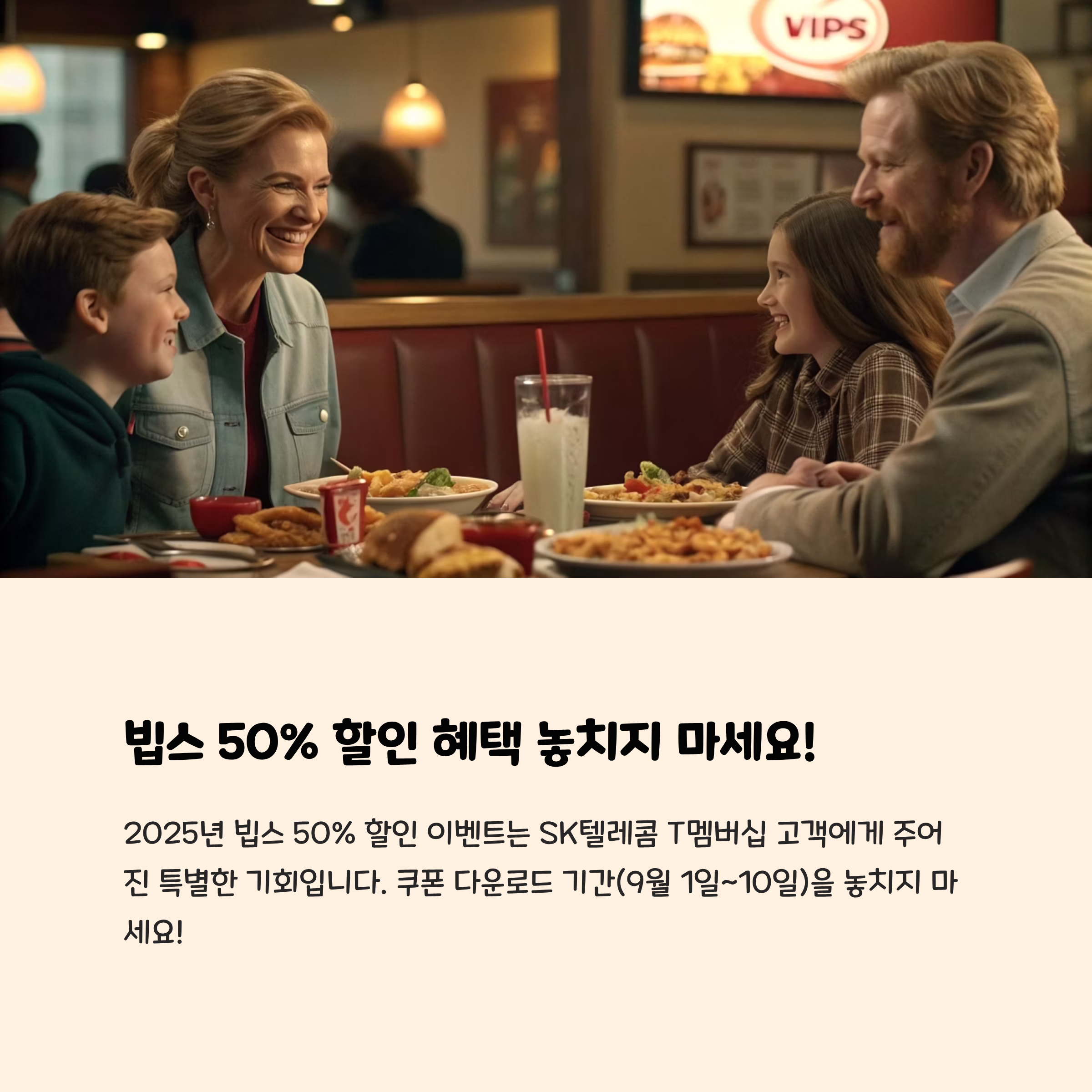2025년 9월, SK텔레콤 T멤버십 고객을 위한 특별한 혜택이 돌아왔습니다. 바로 빕스 50% 할인 쿠폰 이벤트인데요. 샐러드바부터 스테이크까지, 평일에 합리적인 가격으로 즐길 수 있는 기회라 많은 분들이 기다려왔습니다. 이번 글에서는 쿠폰 다운로드 방법, 사용 조건, 할인 한도, 메뉴 가격까지 꼼꼼히 정리해 드릴게요.
