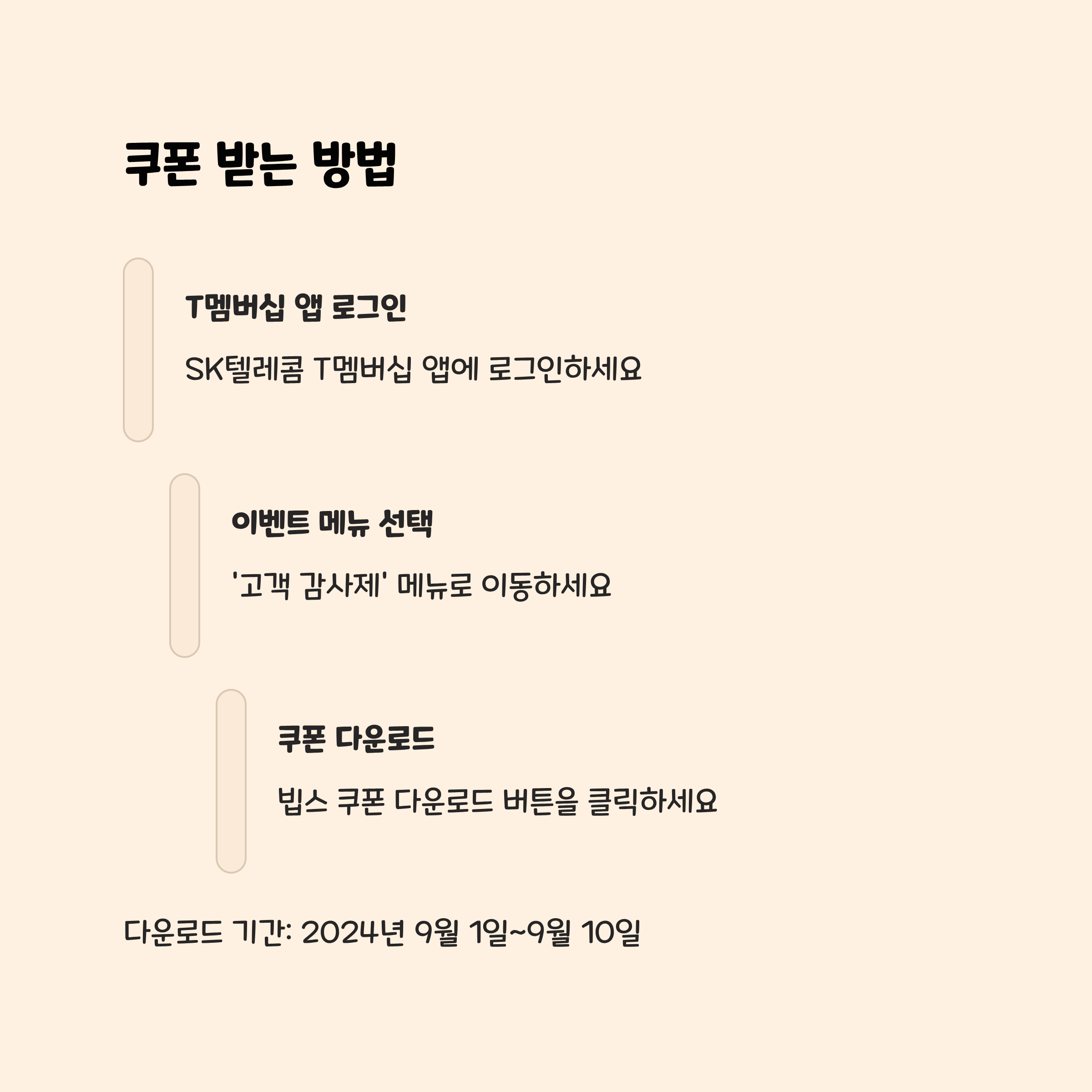 쿠폰은 SK텔레콤 T멤버십 앱에서 간단히 받을 수 있습니다. 앱 로그인 후 이벤트 메뉴에서 ‘고객 감사제’를 선택하고, 빕스 쿠폰 다운로드를 진행하면 끝!