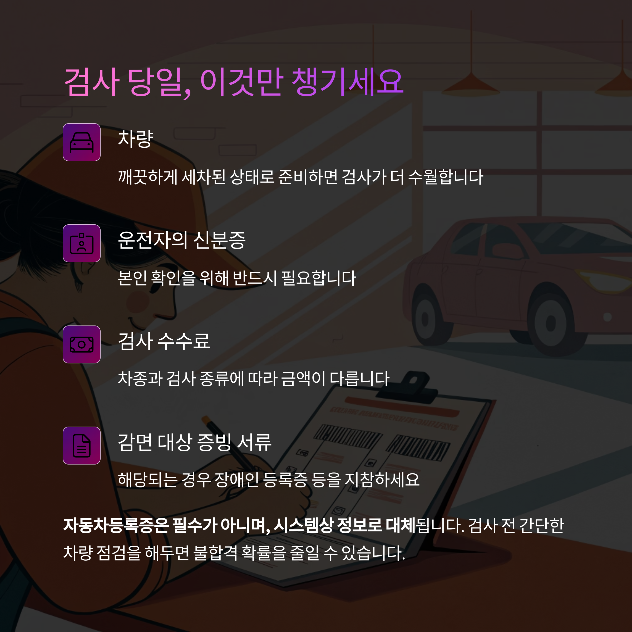 자동차 검사는 단순한 의무가 아닙니다. 운전자 본인과 타인의 생명을 지키는 첫걸음이죠.