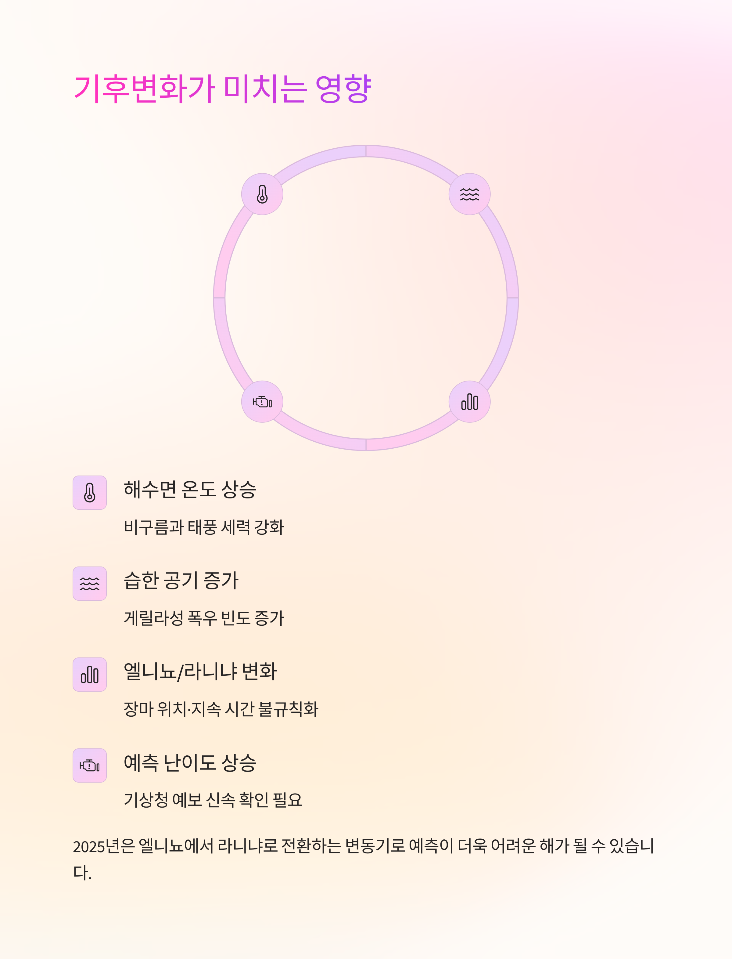 | 엘니뇨/라니냐 변화 | 장마 위치·지속 시간 불규칙화 |