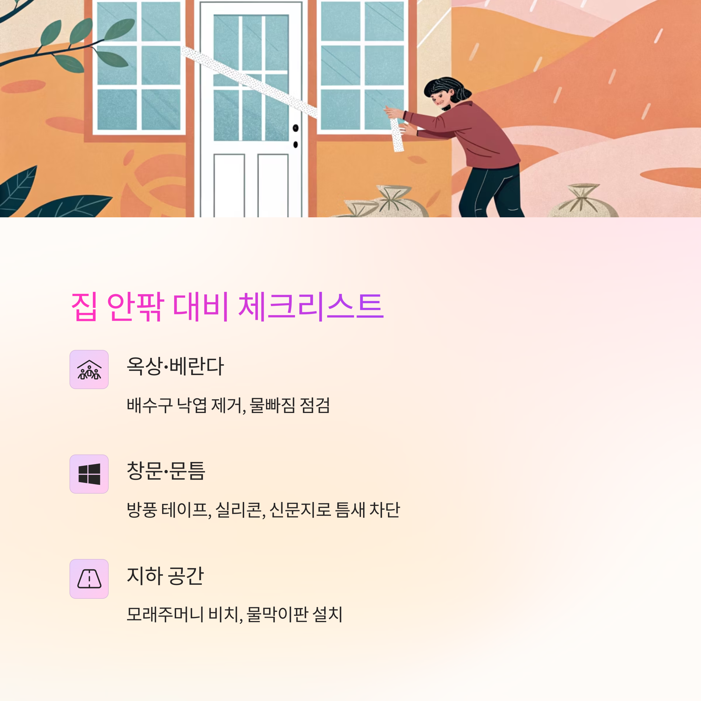 | 집 점검 | 창문, 배수구, 지붕 누수 사전 정비 |