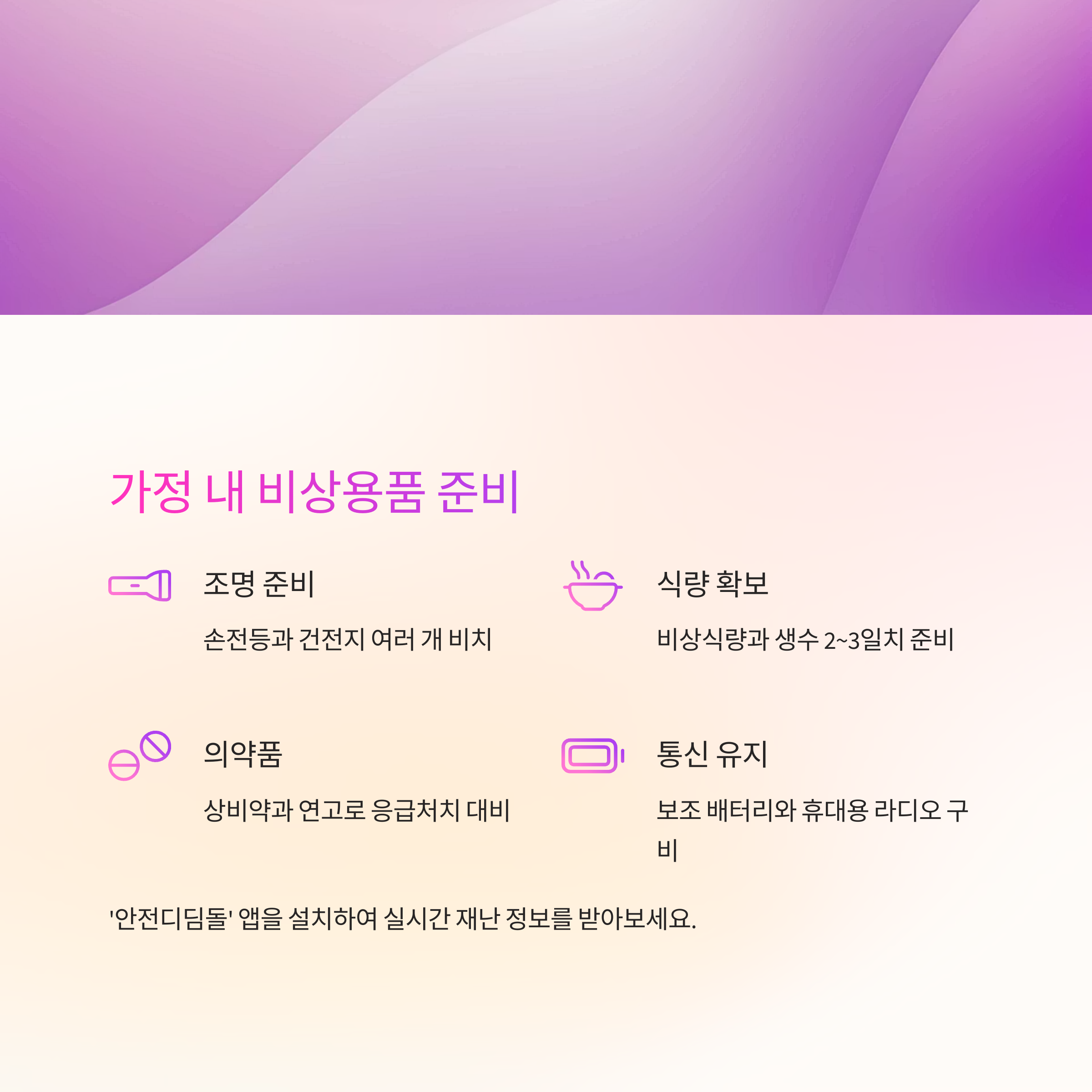 | 비상용품 | 생수·식량·약품·손전등·보조 배터리 확보 |