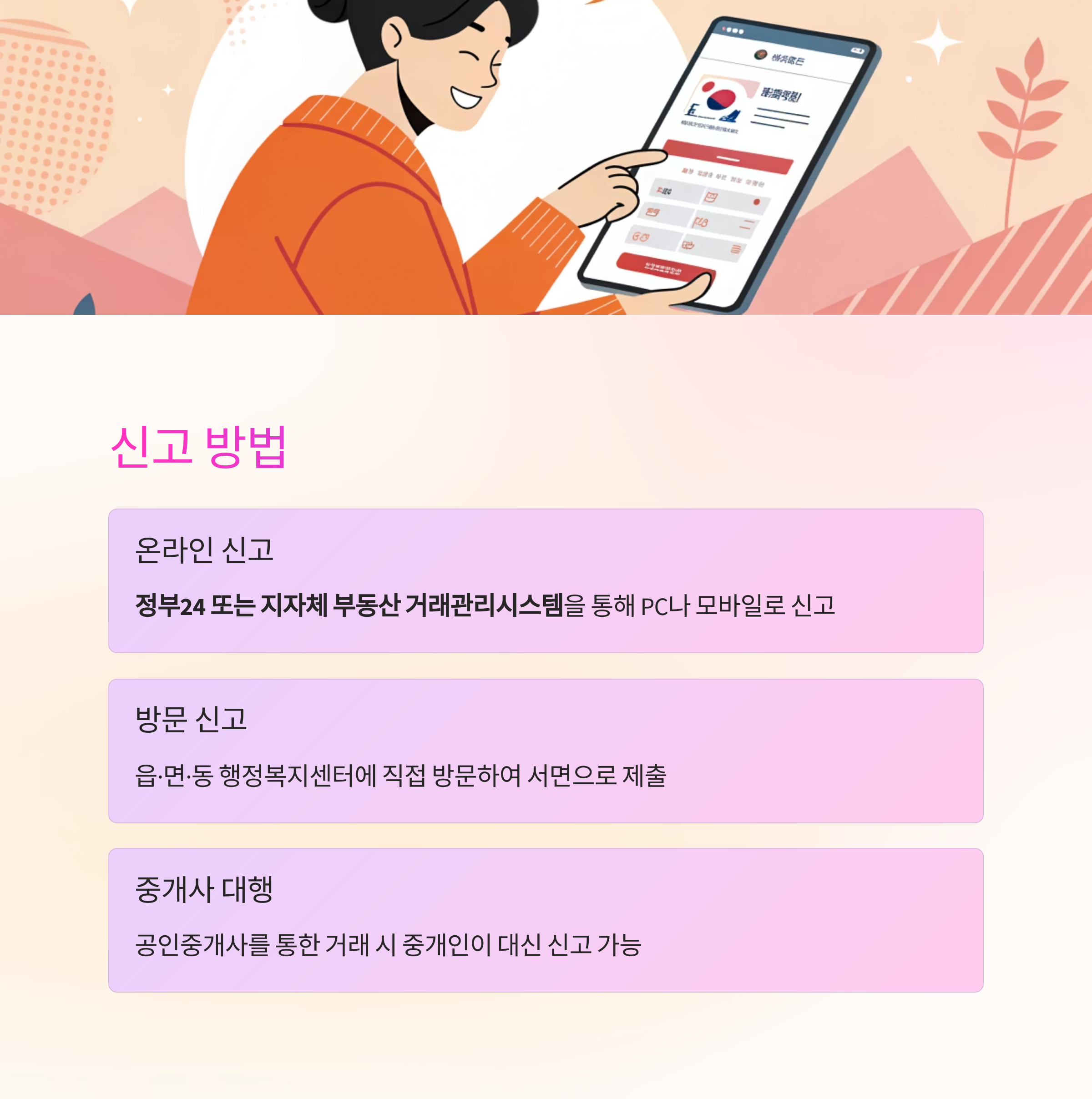 | 온라인 | 정부24 또는 지자체 부동산 거래관리시스템 통해 PC 또는 모바일로 신고 가능 |