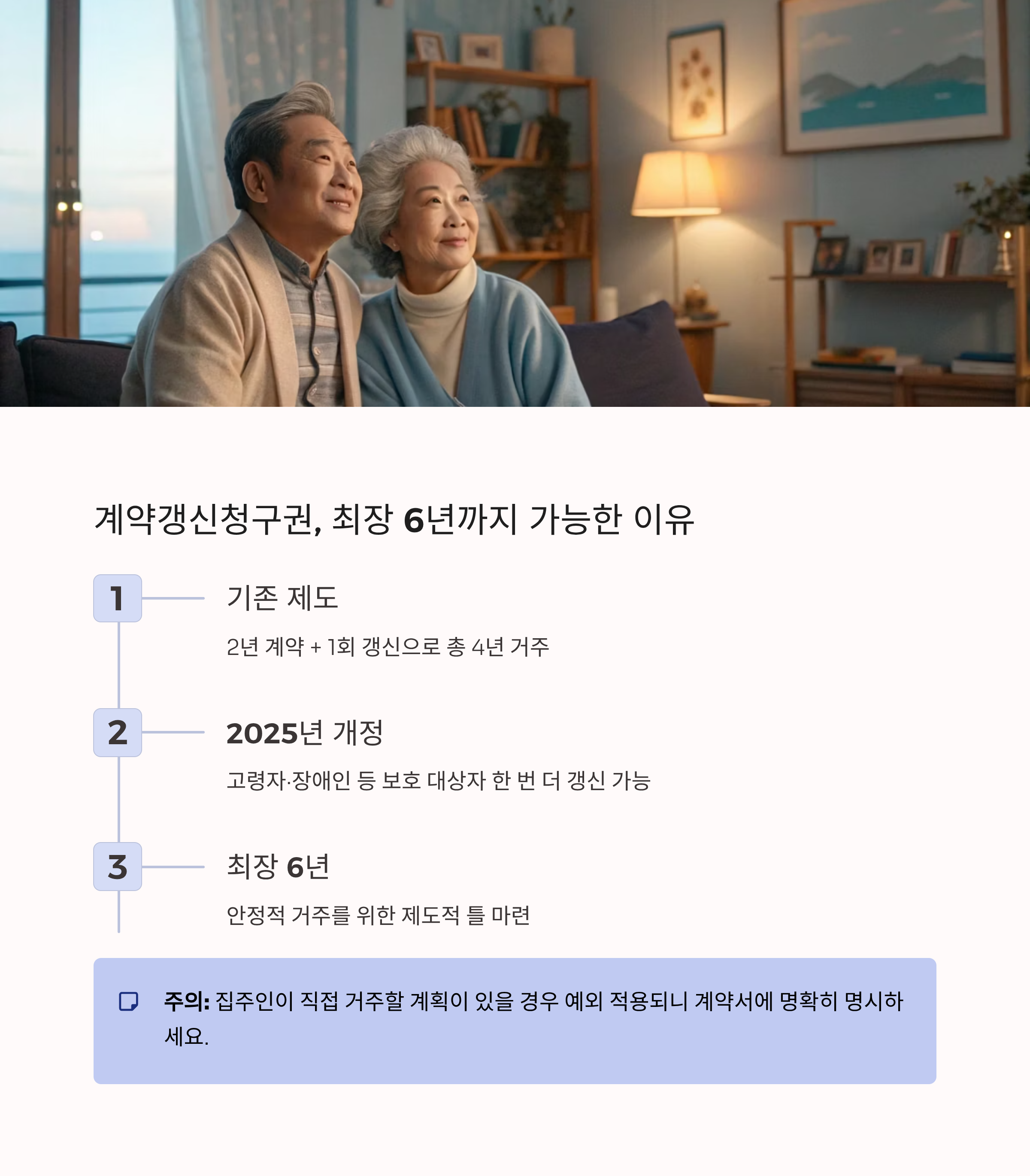 기존엔 2년 계약 + 1회 갱신으로 총 4년만 거주할 수 있었지만, 2025년부터는 고령자·장애인 등 보호 대상자에게 한해 한 번 더 갱신이 가능해집니다.