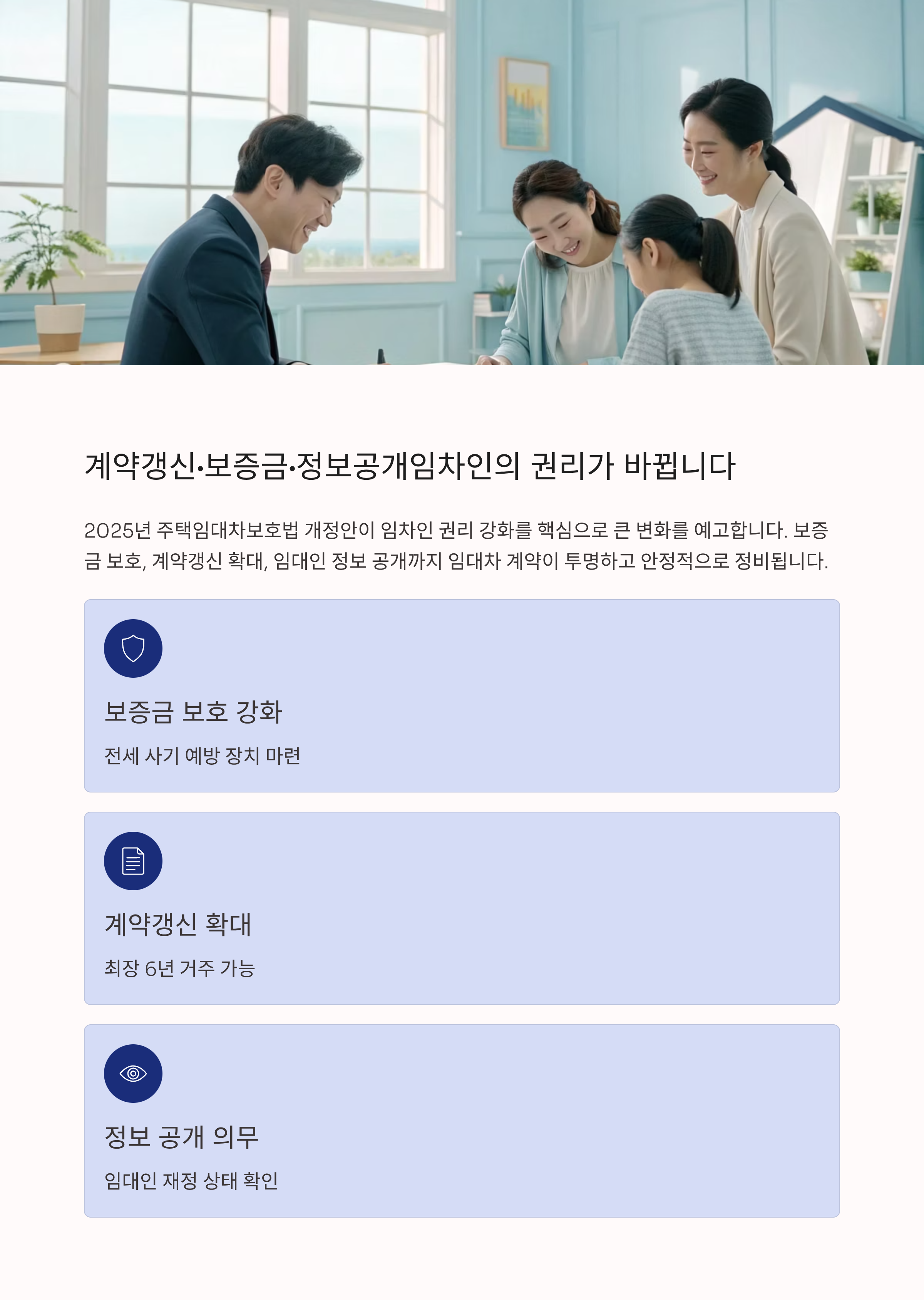 2025년 주택임대차보호법 개정안이 큰 변화를 예고하며 많은 분들의 관심을 끌고 있습니다. 이번 개정의 핵심은 '임차인의 권리 강화'입니다. 보증금 보호, 계약갱신 확대, 임대인 정보 공개까지, 임대차 계약을 둘러싼 중요한 내용들이 한층 더 투명하고 안정적으로 정비됩니다. 특히 전세 사기 예방을 위한 구체적인 법적 장치들이 마련되면서 실거주자들의 불안을 덜어주는 효과가 클 것으로 기대됩니다.
