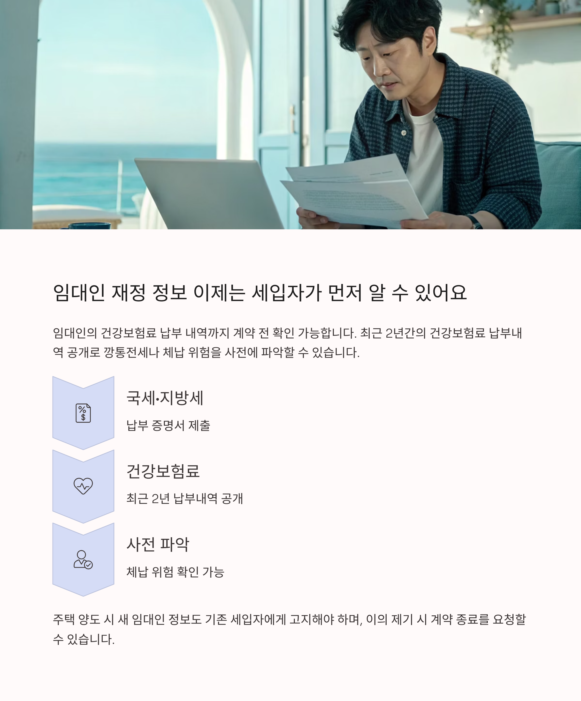 | 임대인 정보 공개 | 세금 납부 증명서만 제출 | 건강보험료 납부 내역까지 확대 |